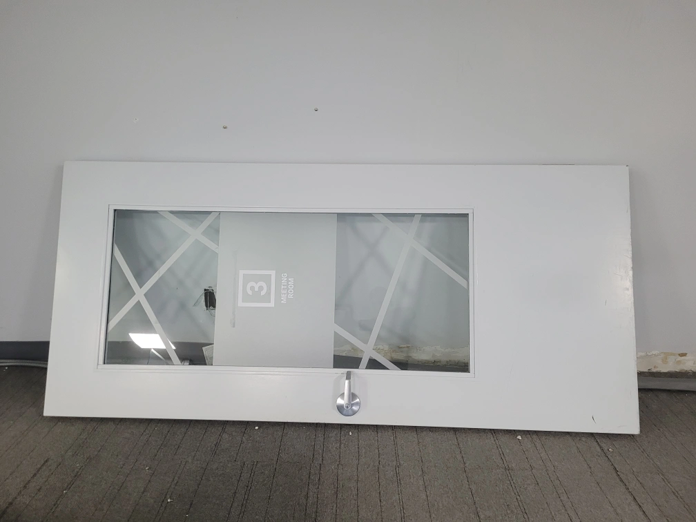 Selling a white office door with a frosted glass window. The glass has a geometric design. Perfect for an office or meeting room setting!