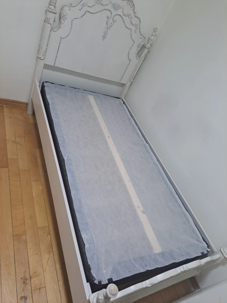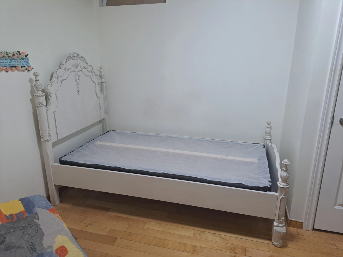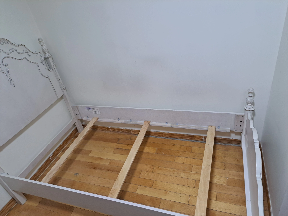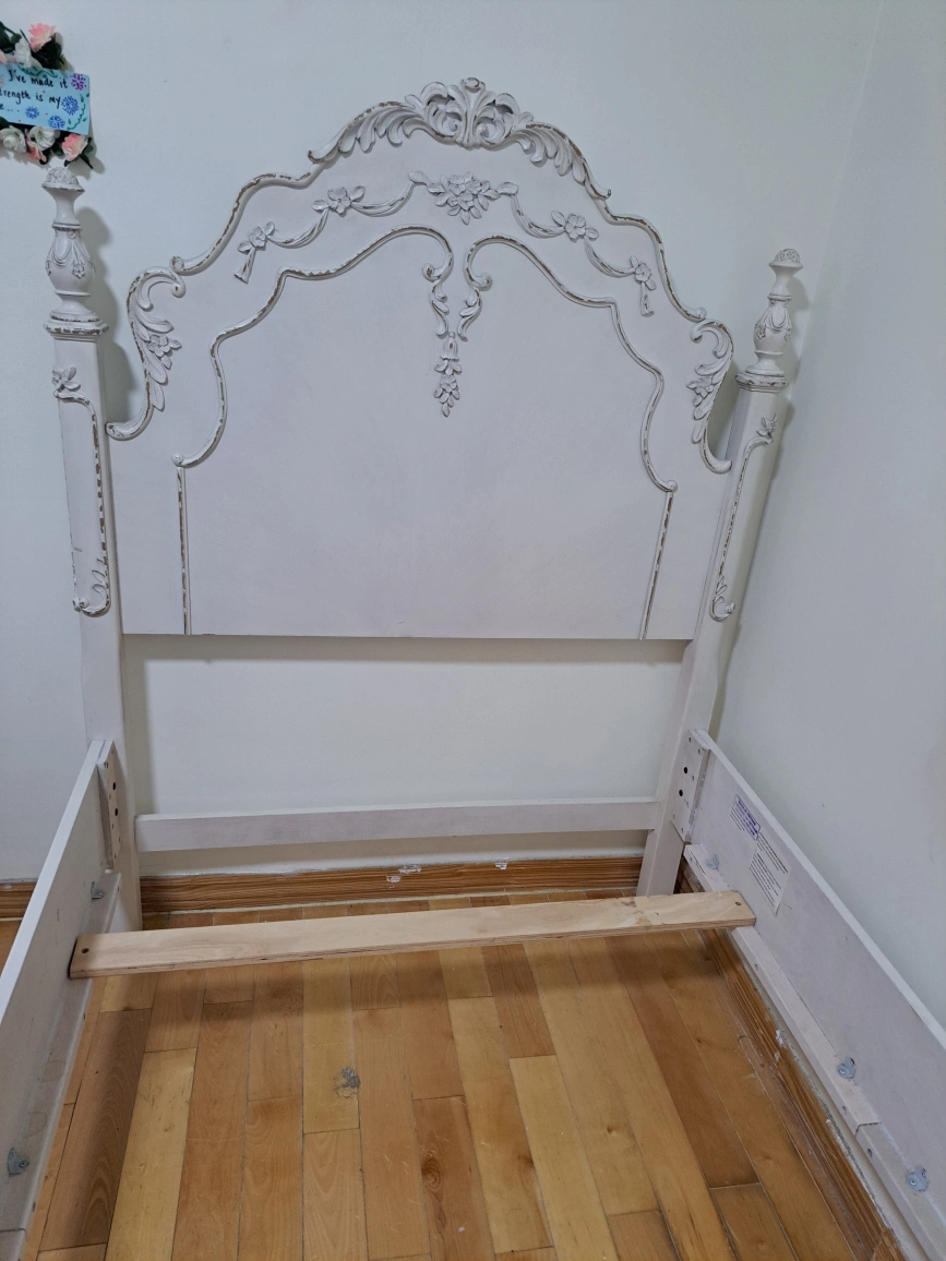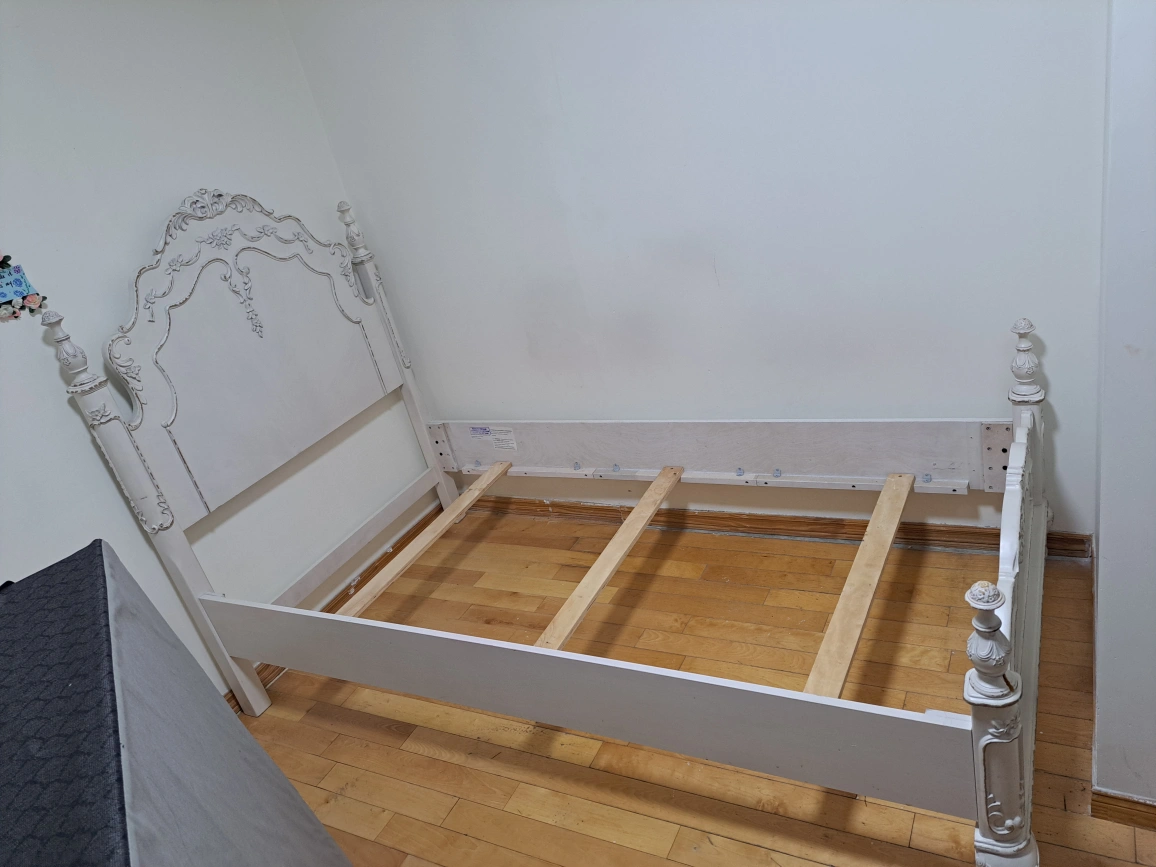 0Selling a charming white bed frame with ornate detailing! The frame comes with the box ans is in good condition and ready for a new home. It features a beautifully designed headboard and sturdy construction. Im selling it as Im moving. The price is negotiable. I will give it to the best offer. Thanks!
