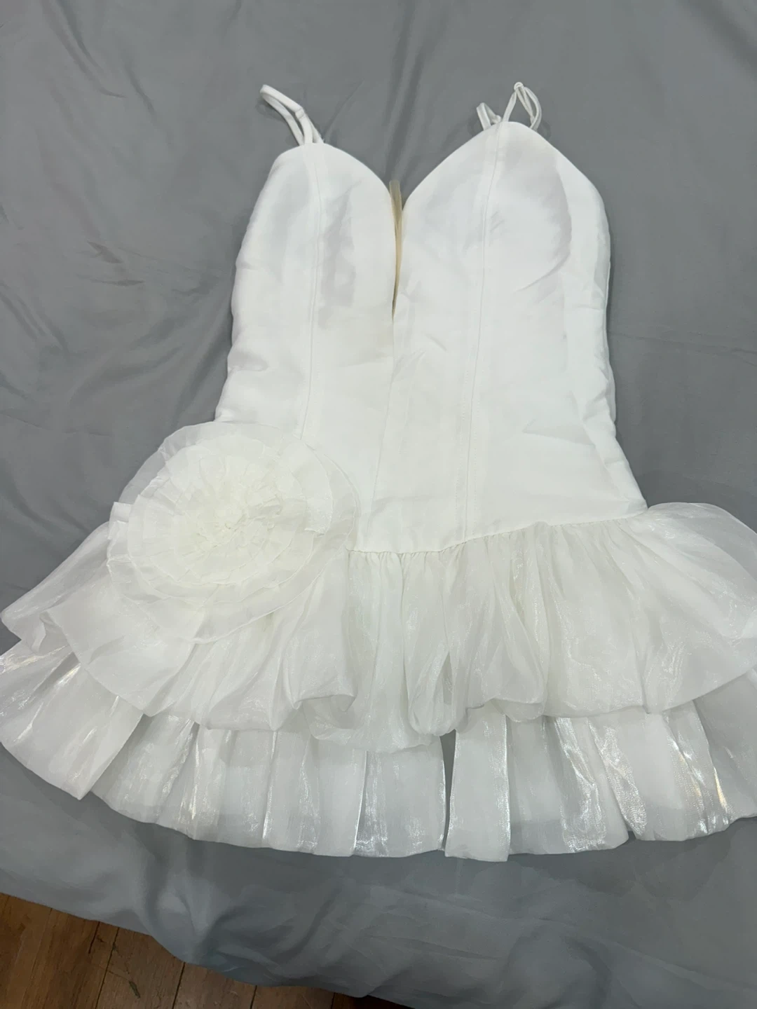 15Selling a cute white party dress! It has a flower detail and a layered skirt. Perfect for a special occasion