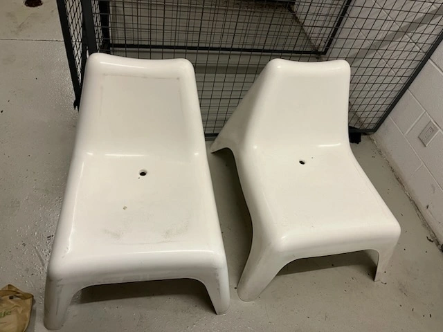 Selling a set of two white plastic chairs. They're perfect for indoor or outdoor use. They have a modern design and are easy to clean. Great for extra seating!