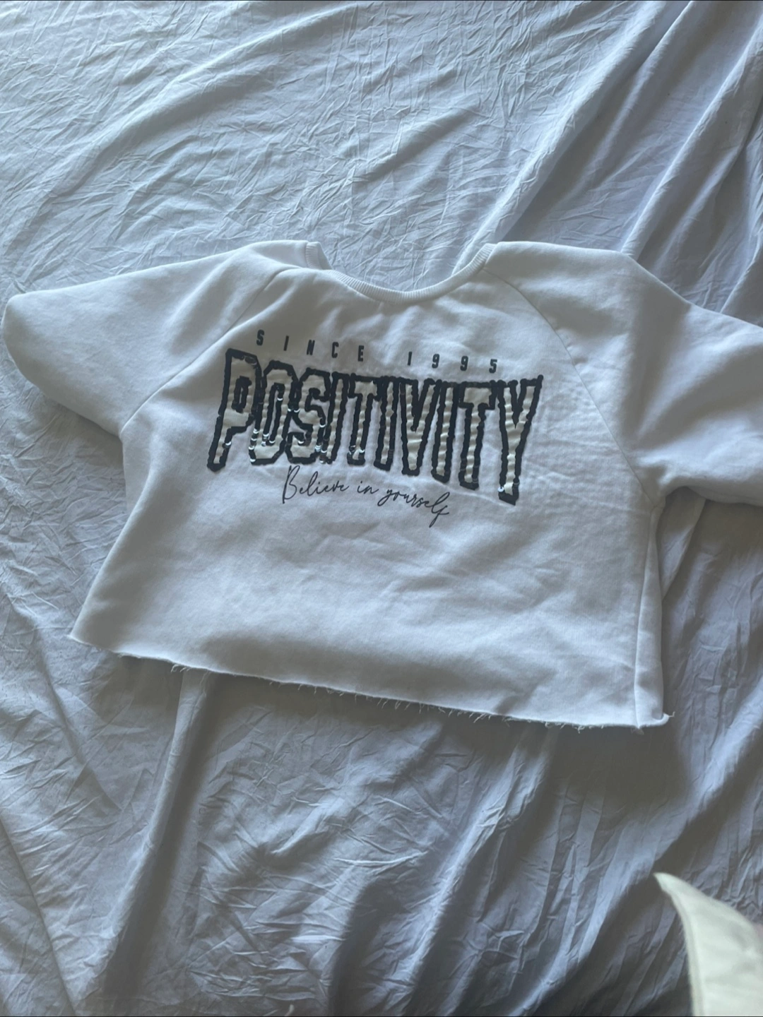10Cute white cropped sweatshirt with 'Positivity' graphic. The graphic reads 'Since 1995 Positivity Believe in yourself'. Great for layering or wearing on its own!