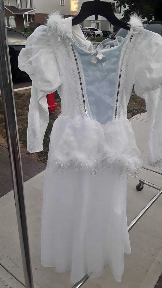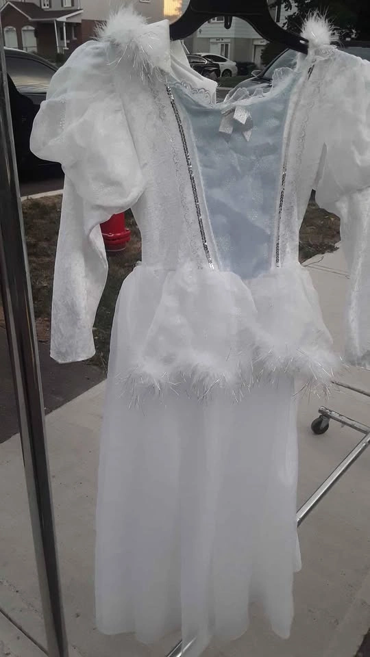 White trimmed gown with blue bib insert. Ideal for angel or princess custume