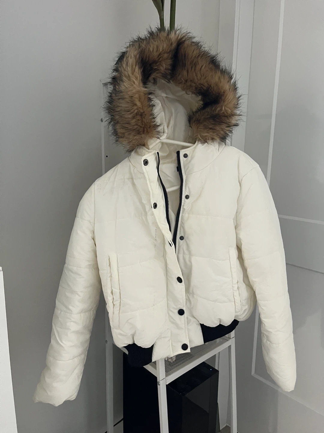 Selling a cozy white puffer jacket! It features a stylish faux fur hood and a button-up front with a zipper underneath. Perfect for staying warm on chilly days!
