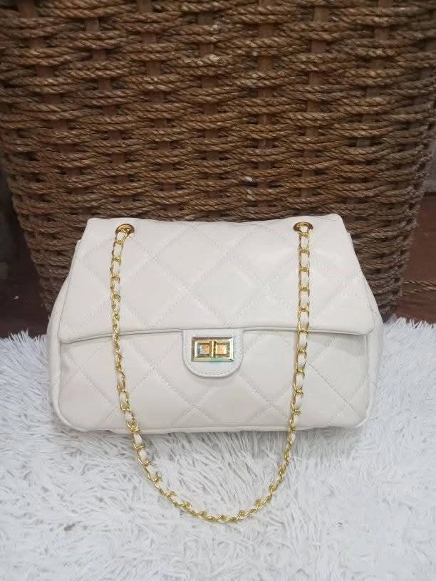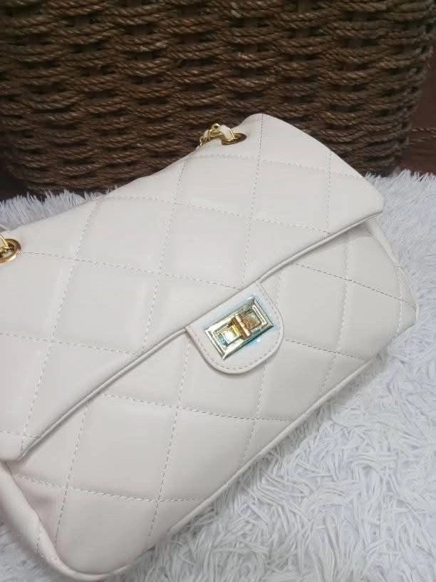Here's a lovely white quilted shoulder bag! It's in great condition and ready for a new home. The gold chain adds a touch of elegance, perfect for any occasion