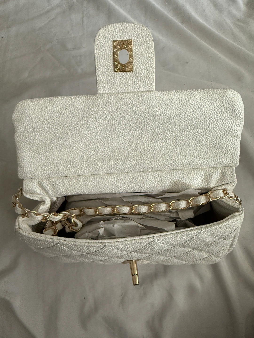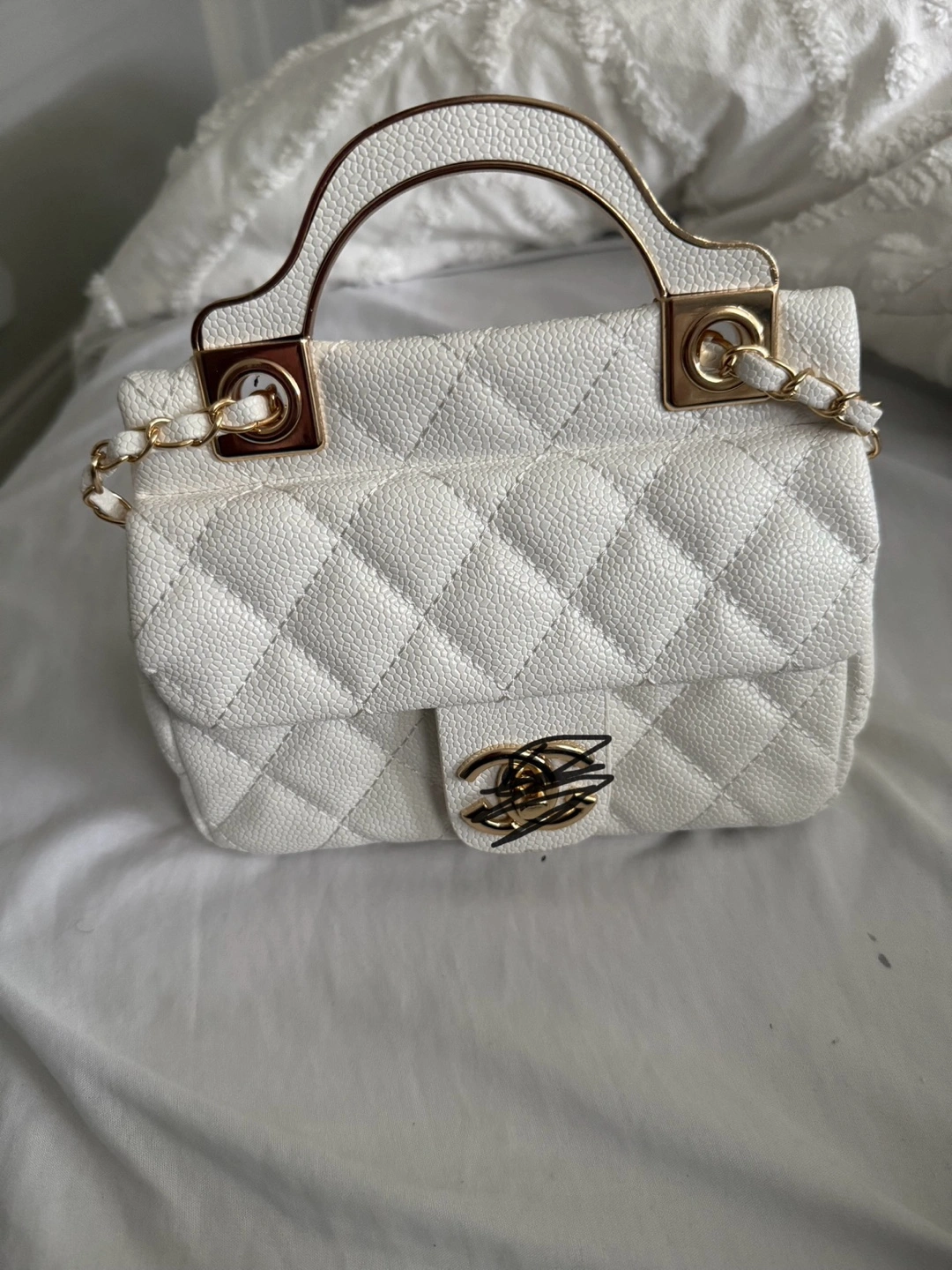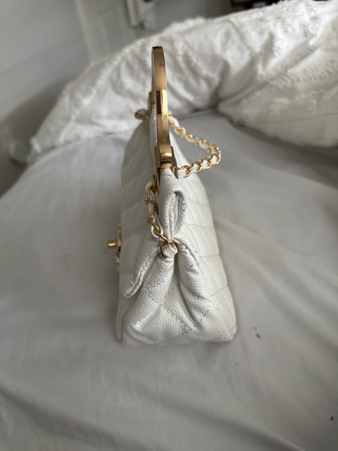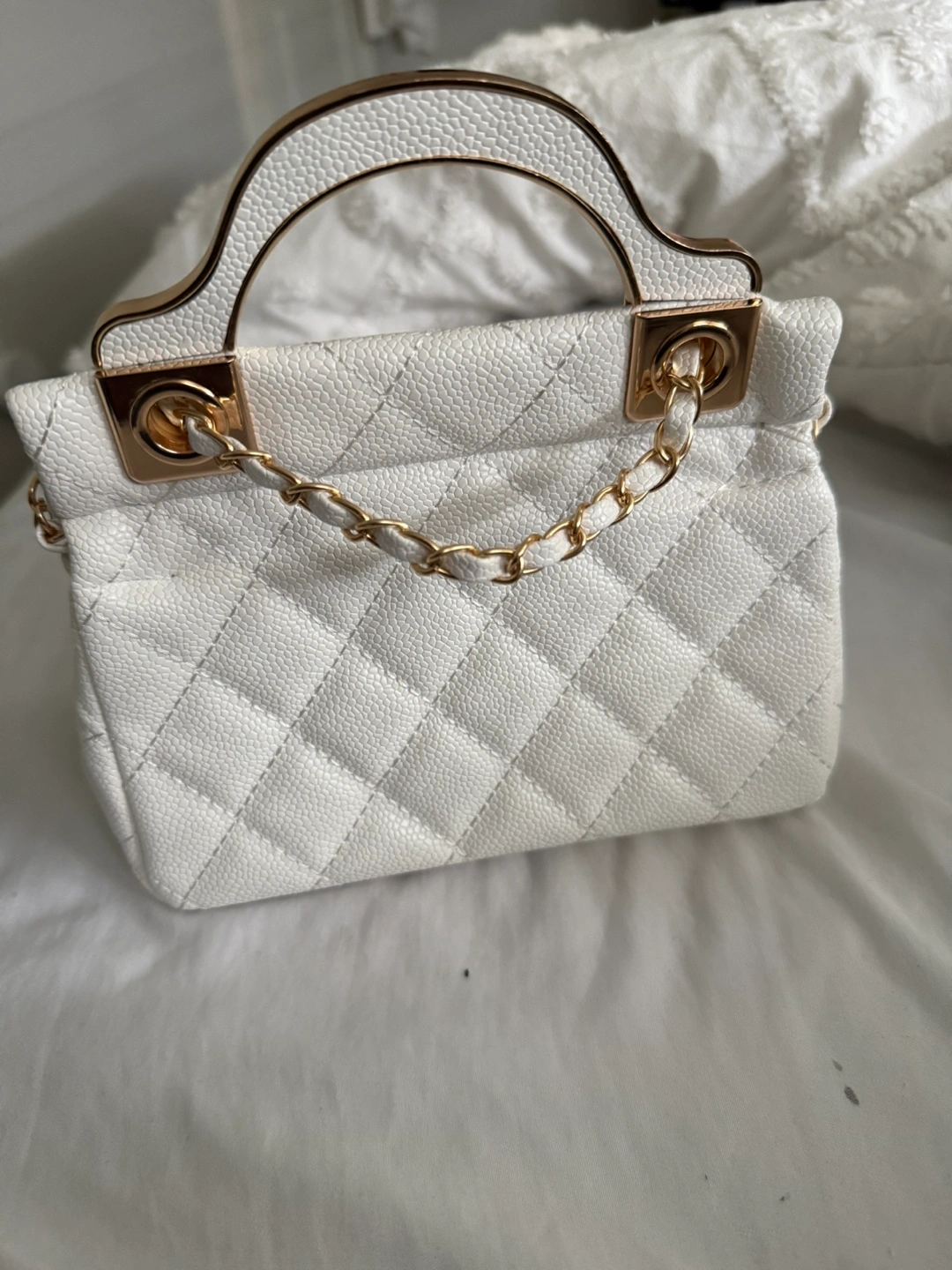 A cute white quilted bag with a top handle and gold chain detailing! It's in great condition and perfect for adding a touch of elegance to any outfit