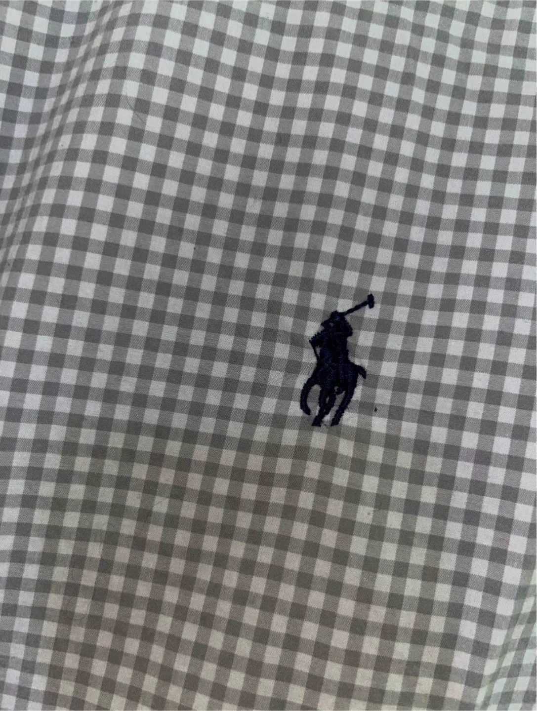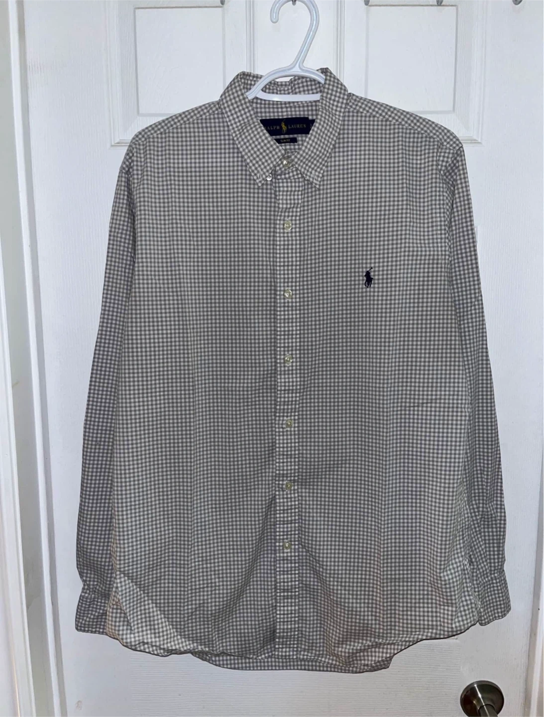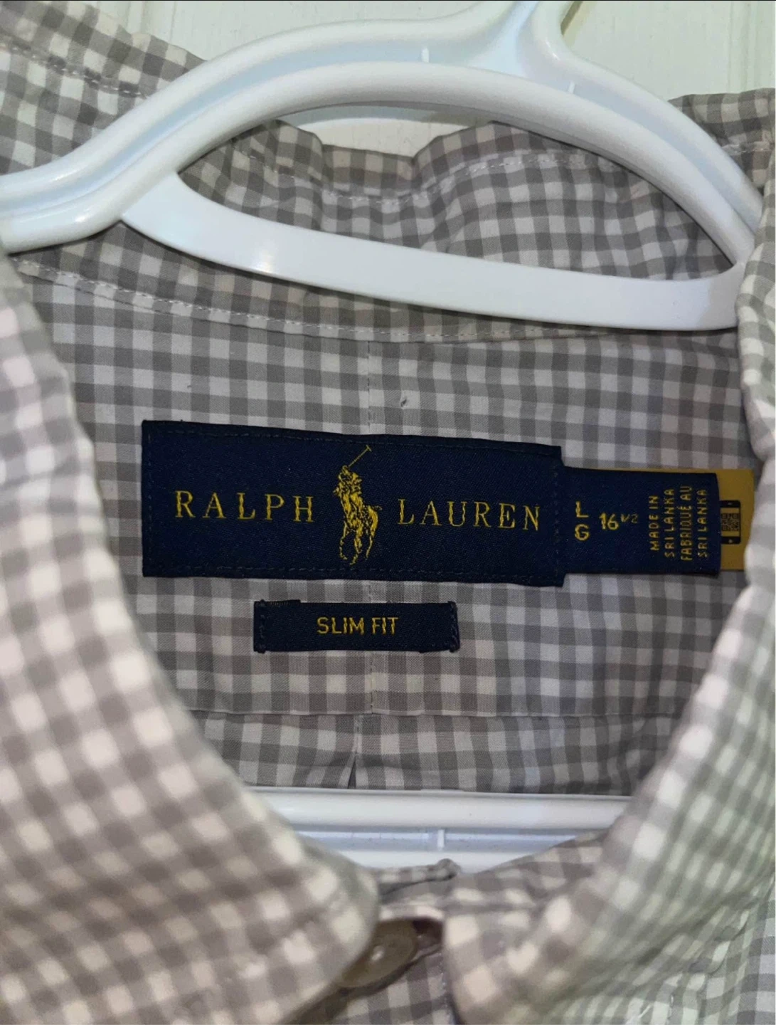 Selling a white Ralph Lauren slim fit dress shirt in a grey and white gingham pattern! It's a size large (16 1/2). This stylish shirt is in great condition and ready for a new home. Shipping always available. Text any questions.