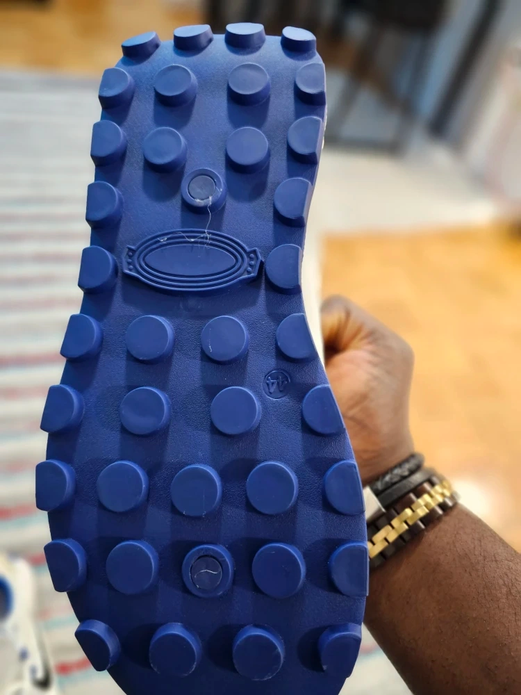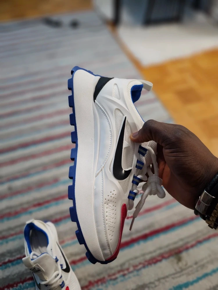 89These sneakers feature a unique design with white, red, and blue accents. They have a 'Stay Wild' tag, giving them a distinct style. The soles are a striking blue with a textured pattern. They appear to be in good condition and ready for a new home!