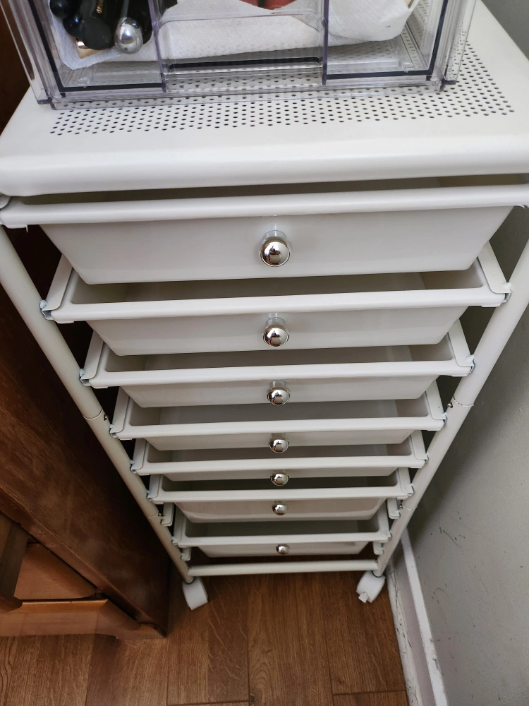 Here's a handy rolling cart with 8 drawers, perfect for organizing all sorts of things! It's in great shape and ready to help you declutter your space. The cart is white, and the drawers slide out smoothly. Great for a craft room, office, or anywhere you need some extra storage