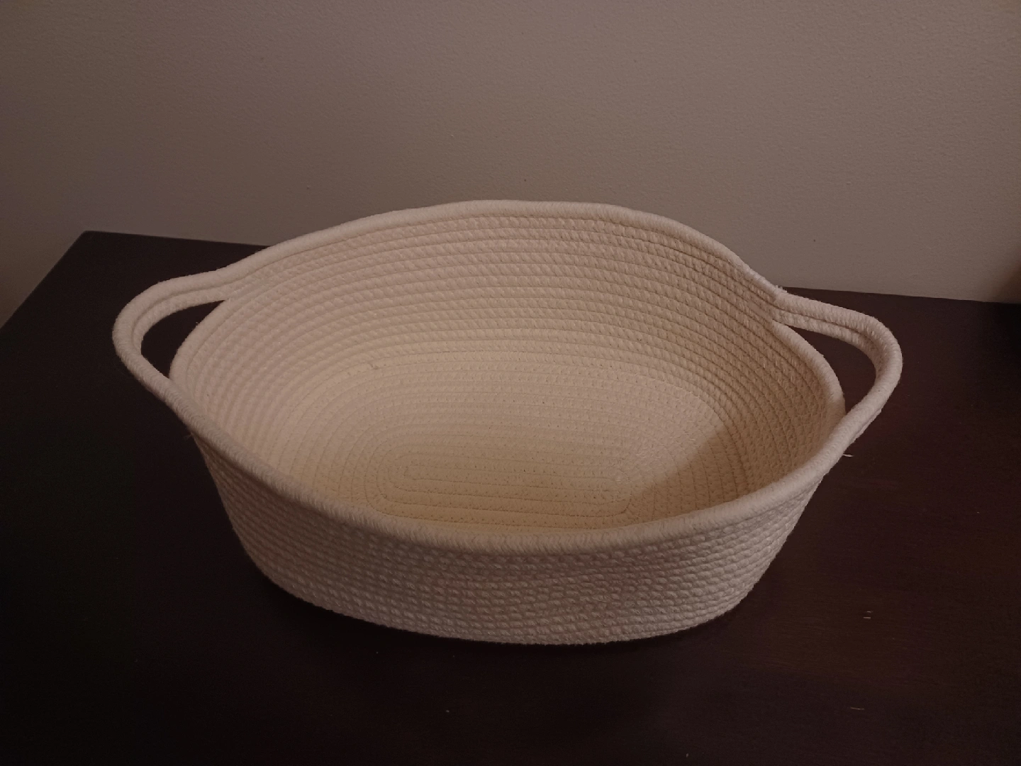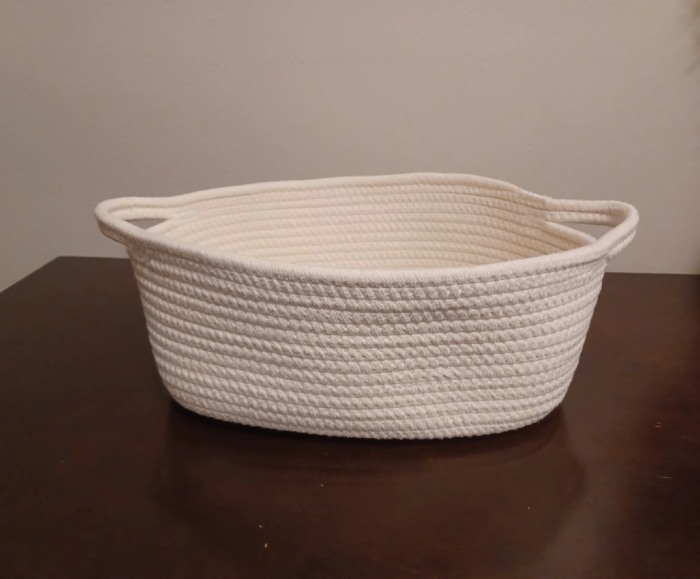 Selling a lovely white rope basket in great condition! The basket is made of soft, durable rope and features convenient handles for easy carrying. Height and lengths are approximately 5 and 13 inches