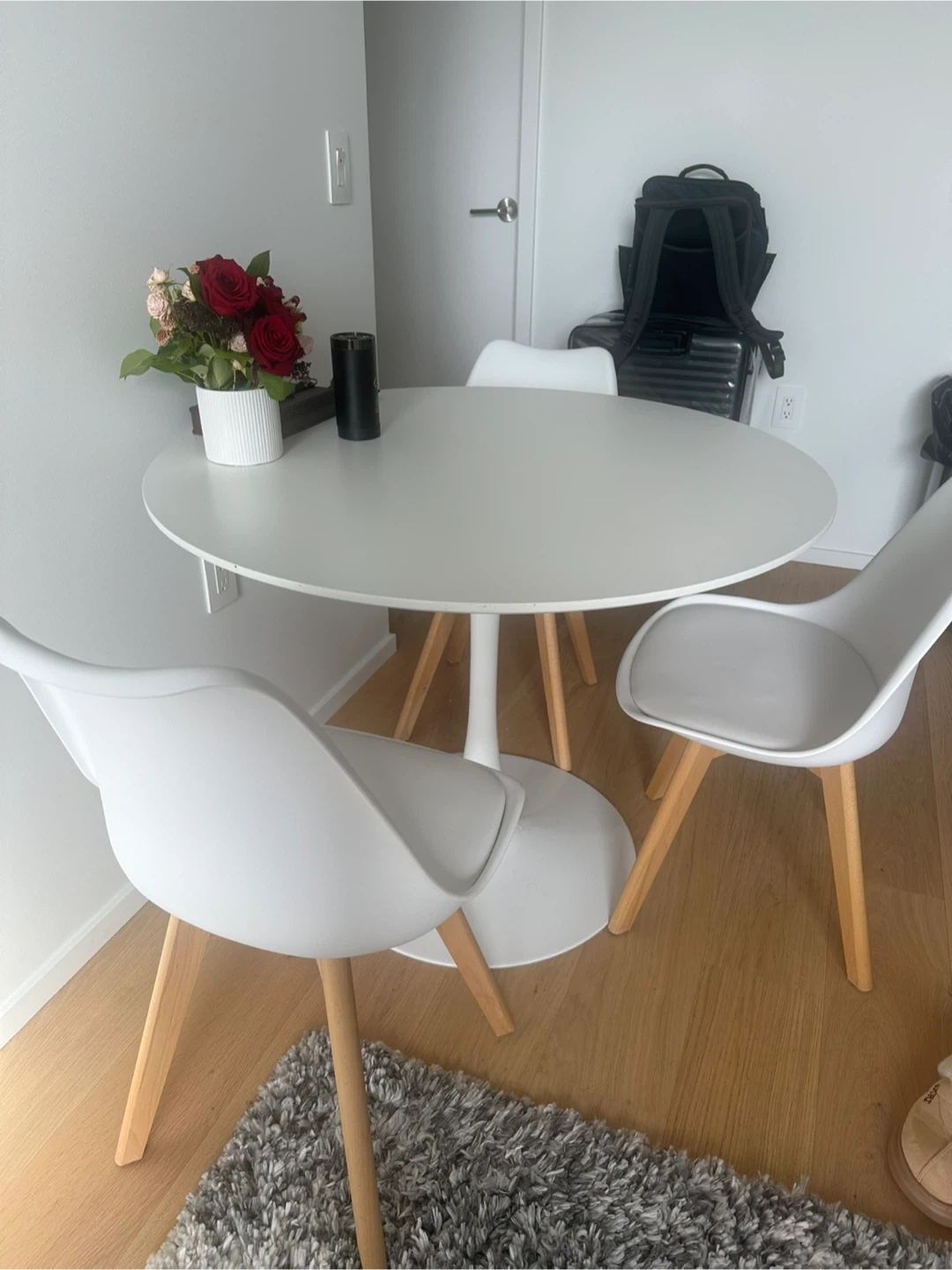 36Selling a round dining table with four chairs. The set is in great condition and would be perfect for a small apartment or dining area. The table is white and the chairs have wooden legs. They’re a great addition to any home!