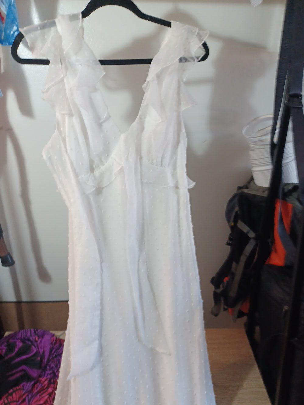 85Selling a lovely white dress with ruffle detailing! It has a V-neck and an open back with tie closure, perfect for a summer day or special occasion. The dress is lightweight and flowy, making it super comfortable to wear. It's in great condition and ready for a new home!