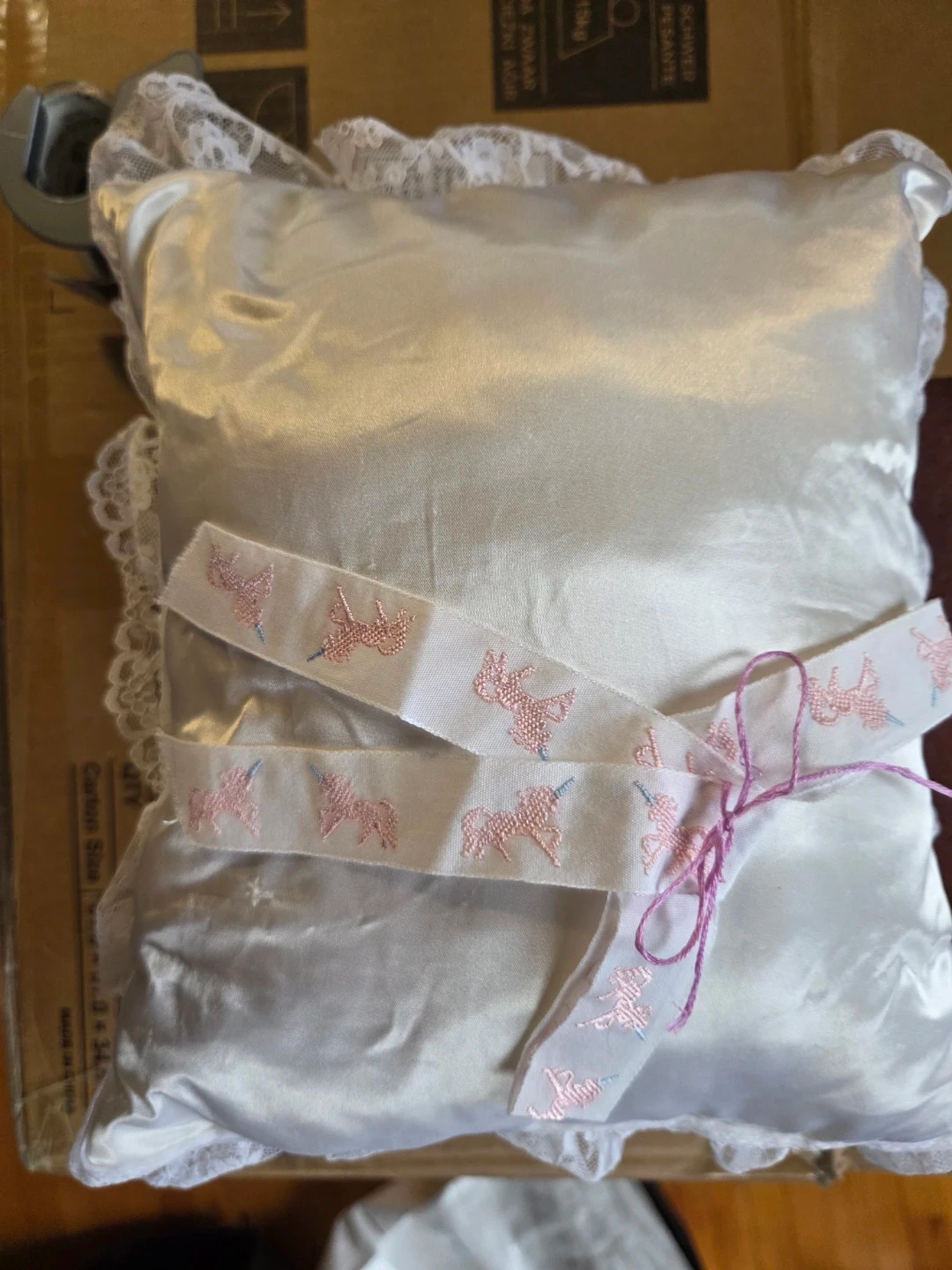 White Satin and lace Ring barrier Pillow with Unicorn Ribbon