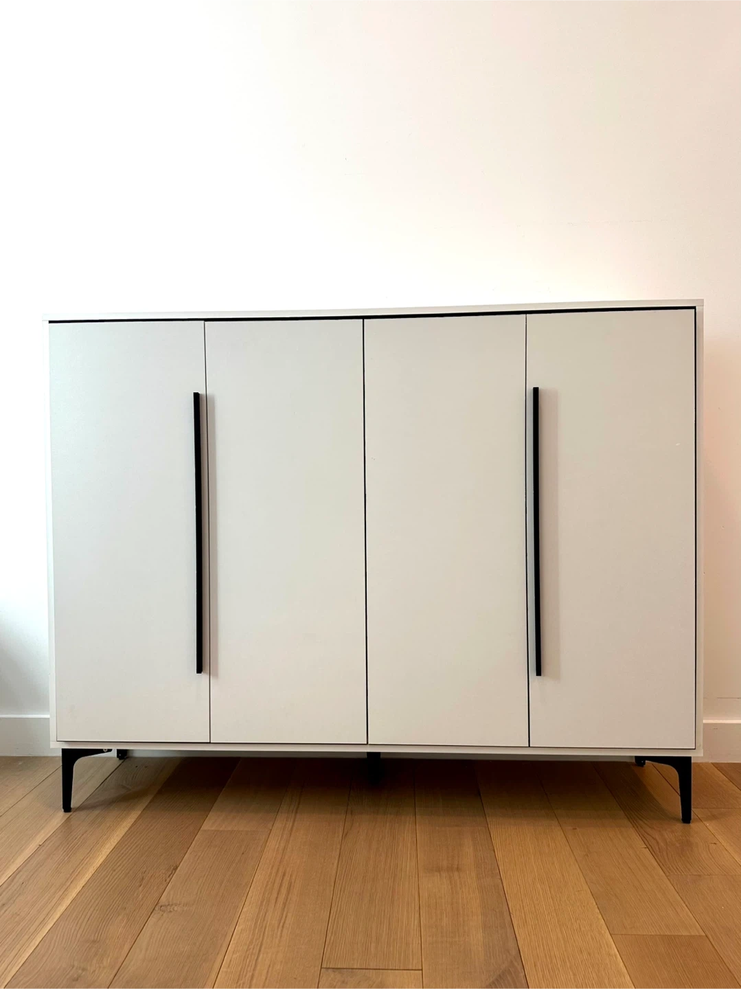 129Here's a stylish white cabinet with four doors and sleek black handles and legs. It offers ample storage space with shelving inside, perfect for organizing your shoes or other belongings. Adjustable shelves. High 43”, Width 55”, Depth 14.5”. In very good conditions