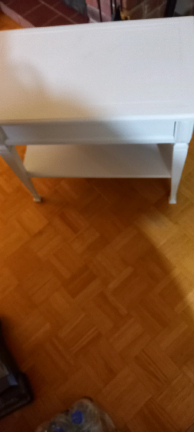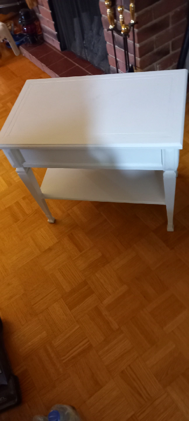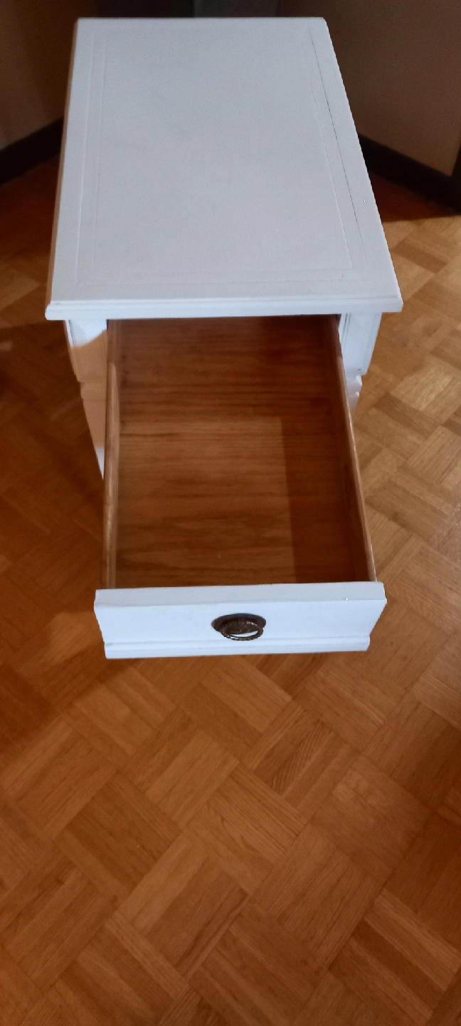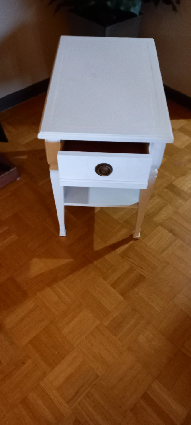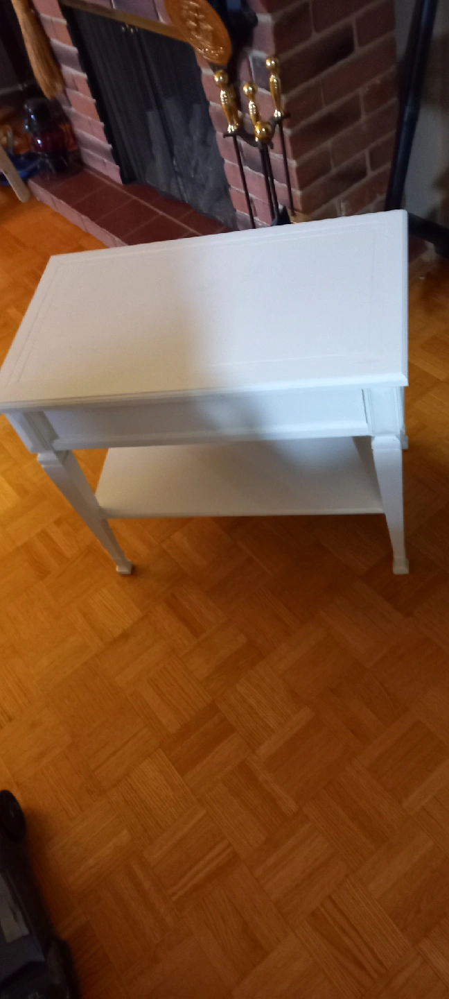 Here's a cute little white side table with a drawer and a shelf. It's perfect for a bedside table or as an accent piece in your living room. The drawer slides smoothly, and the shelf provides extra storage space