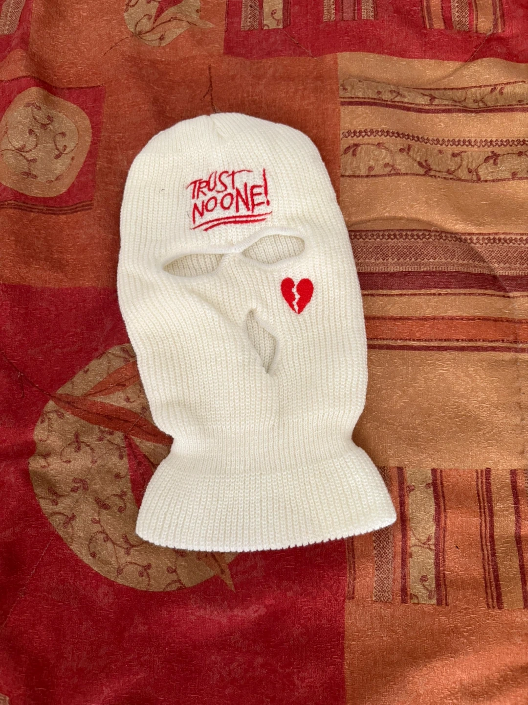 Cozy white ski mask with a unique design! It features the phrase 'Trust No One!' embroidered above the eye holes and a small broken heart near the mouth opening. Perfect for keeping warm and making a statement
