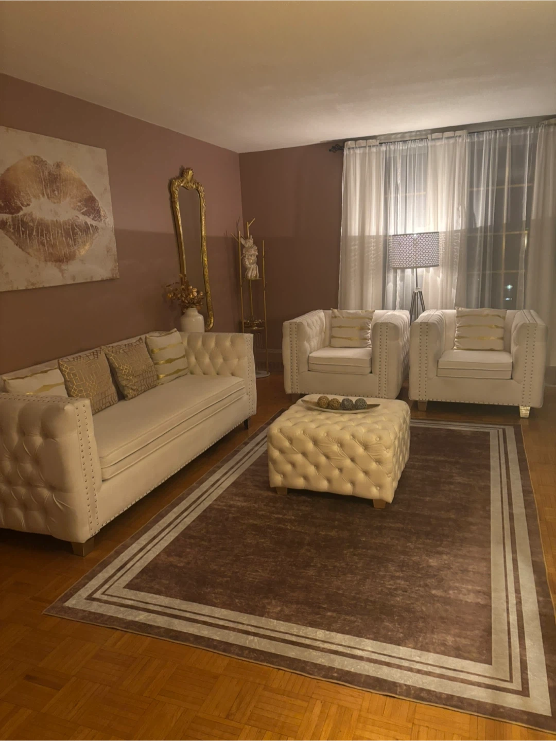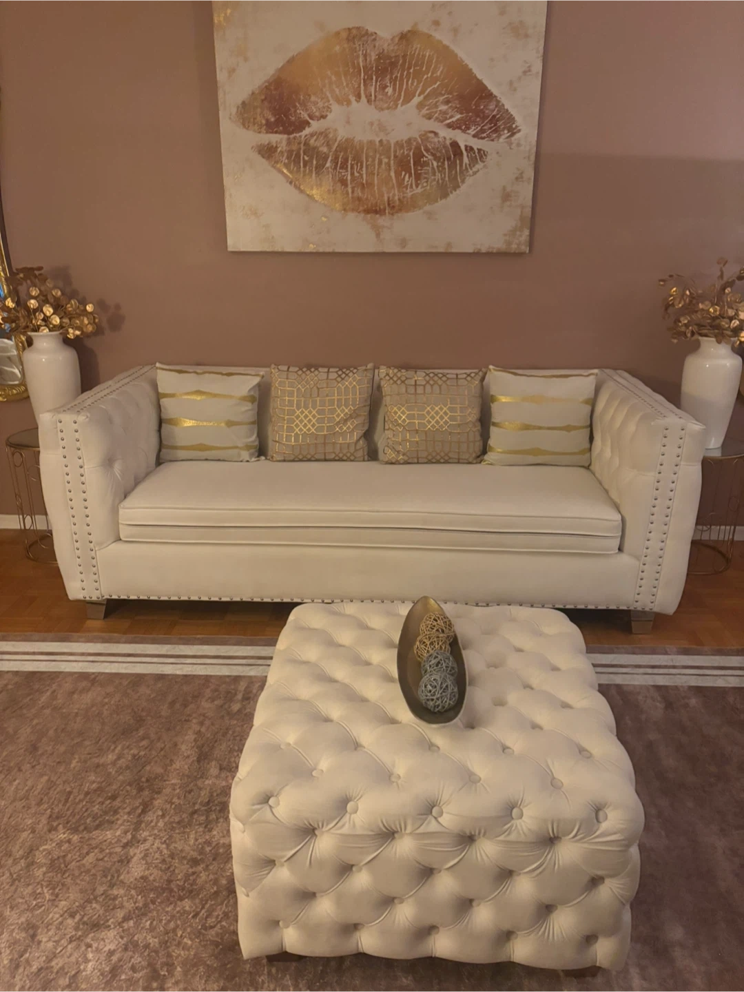 10Selling a beautiful set of white furniture, including a sofa, two chairs, and an ottoman. This set would be perfect for a living room or sitting area. The pieces are in good condition and ready for a new home! 4376048767