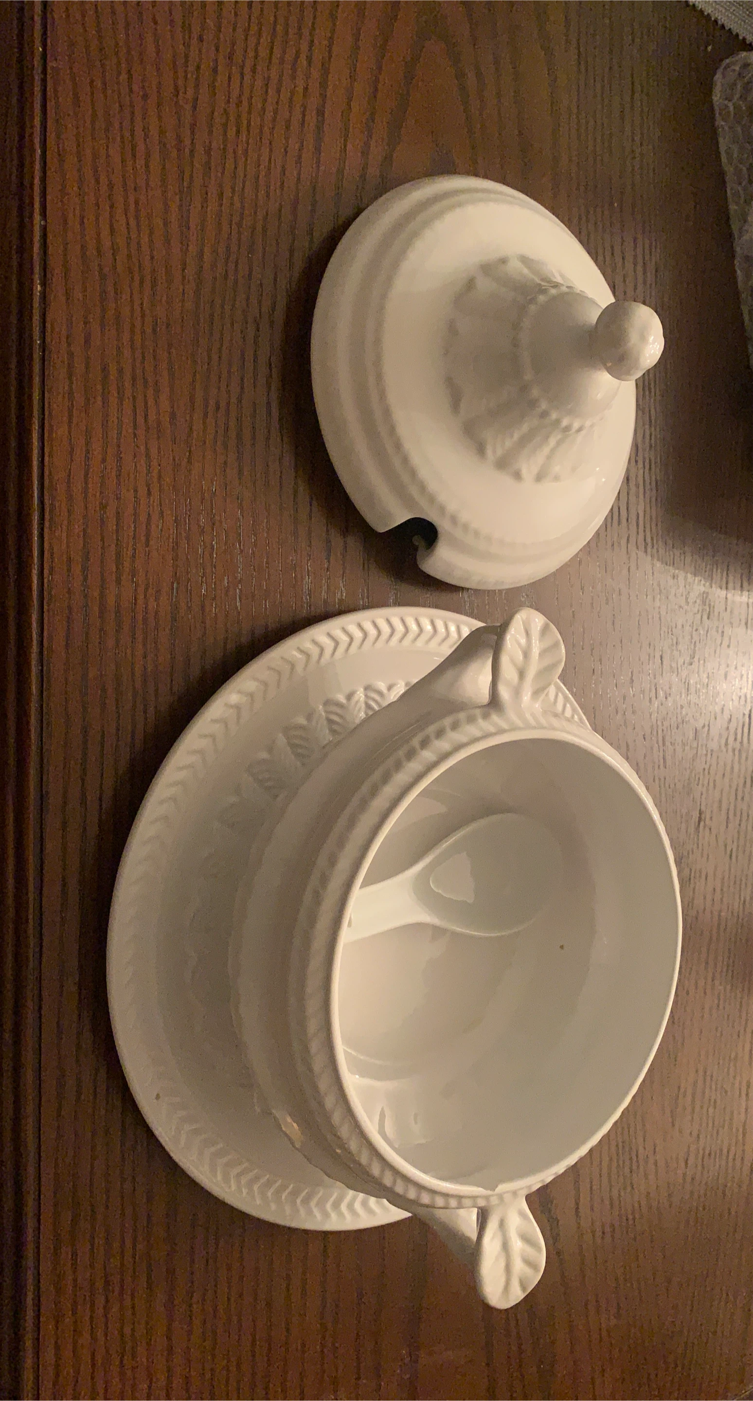 46Selling a lovely white soup bowl set! It comes with a matching lid, plate, and even a spoon. Perfect for enjoying a cozy bowl of soup on a chilly day