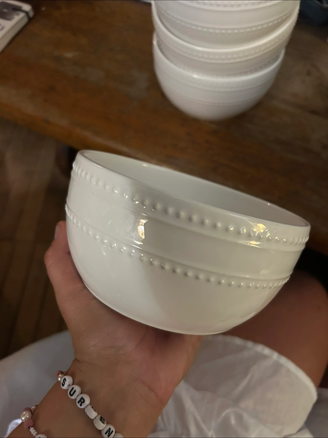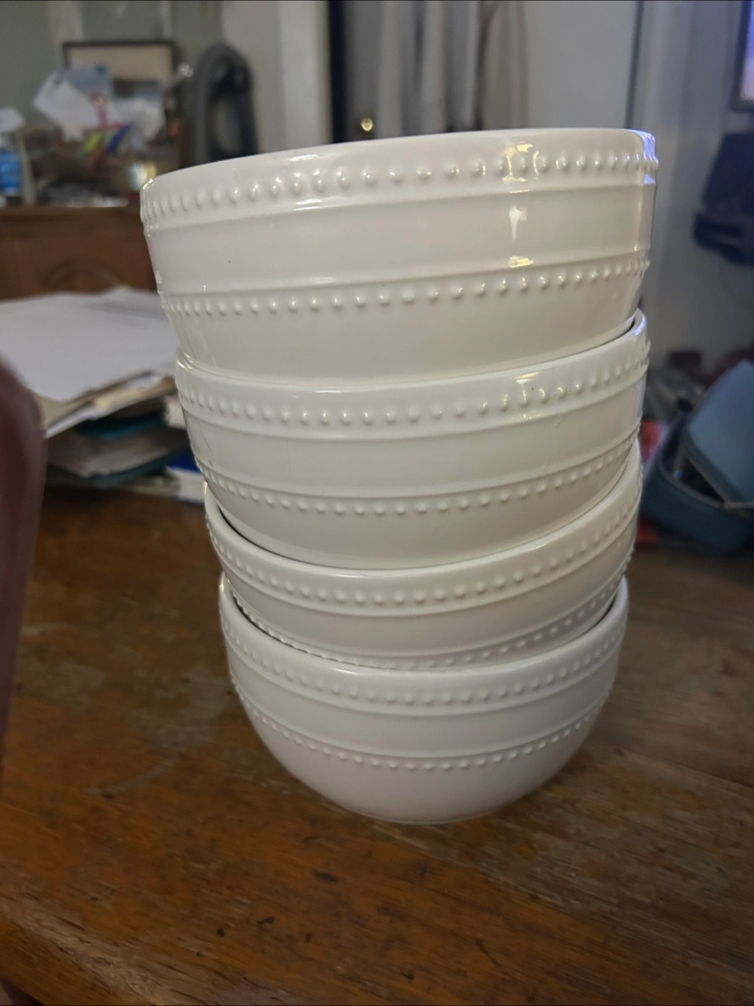 I'm selling a set of four white soup bowls. They're perfect for soups and or stews. Microwaveable and dishwasher safe.