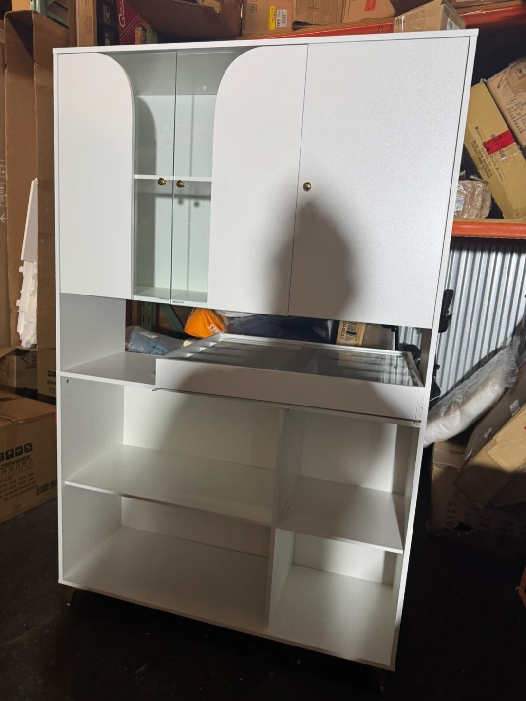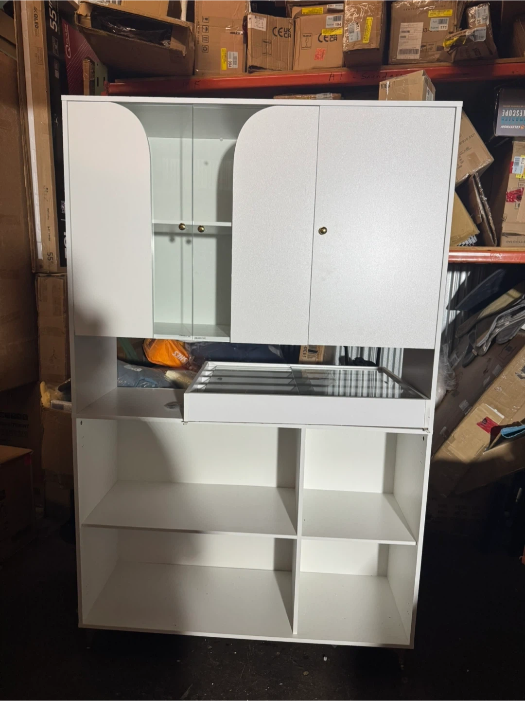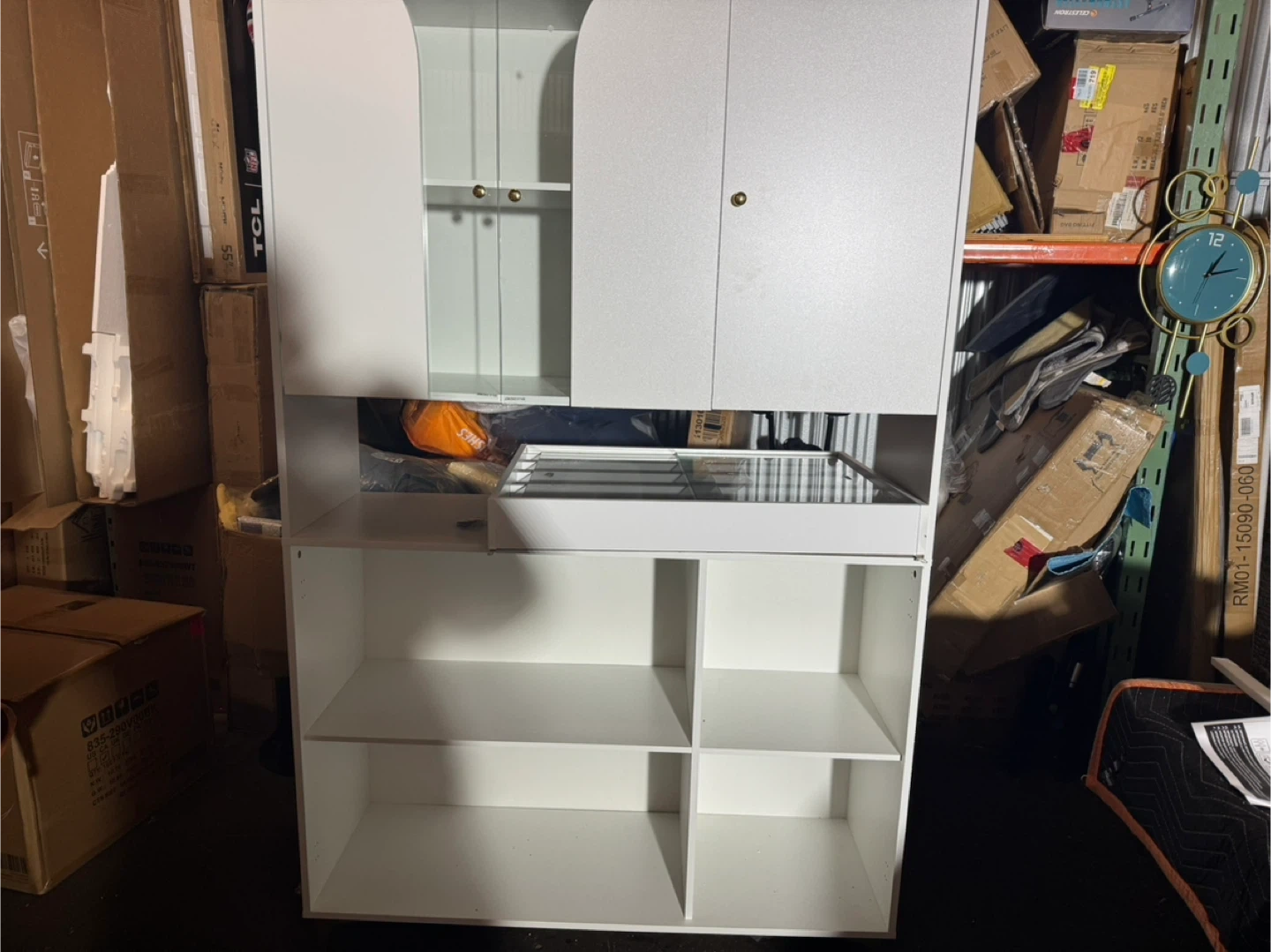 39Selling a white storage cabinet that would be great for organizing your space. It has both closed cabinets and open shelving, offering versatile storage options. Perfect for a living room, bedroom, or office!