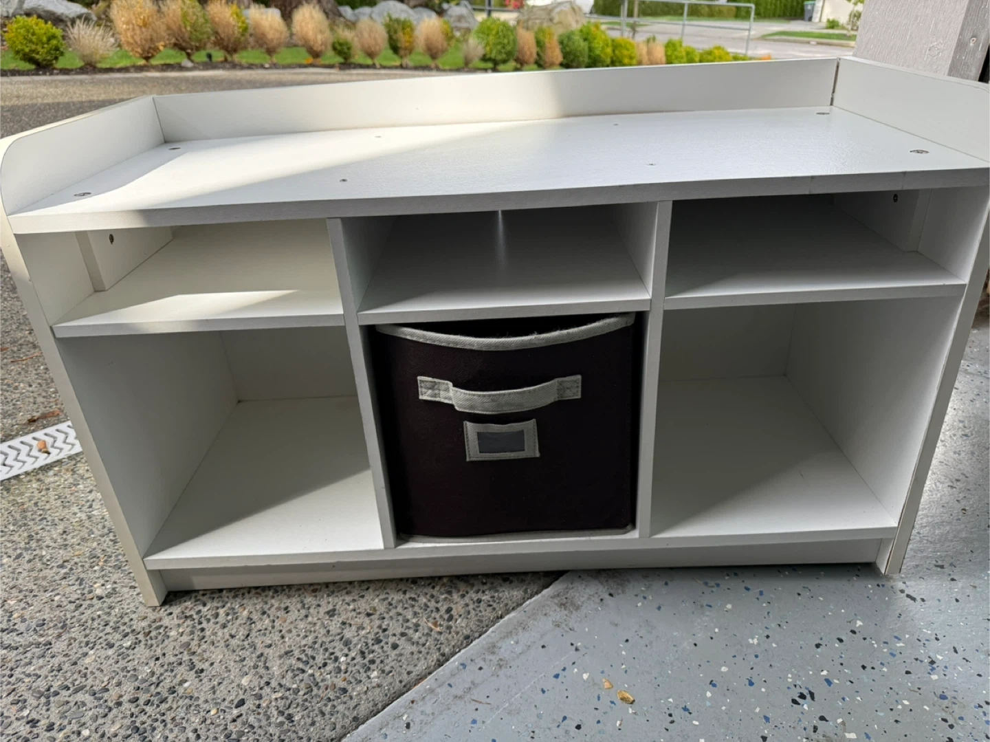 Selling a white storage shelf unit. It has a variety of different sized compartments for storage. Perfect for organizing toys, books, or other items. There's a dark brown storage bin included as well