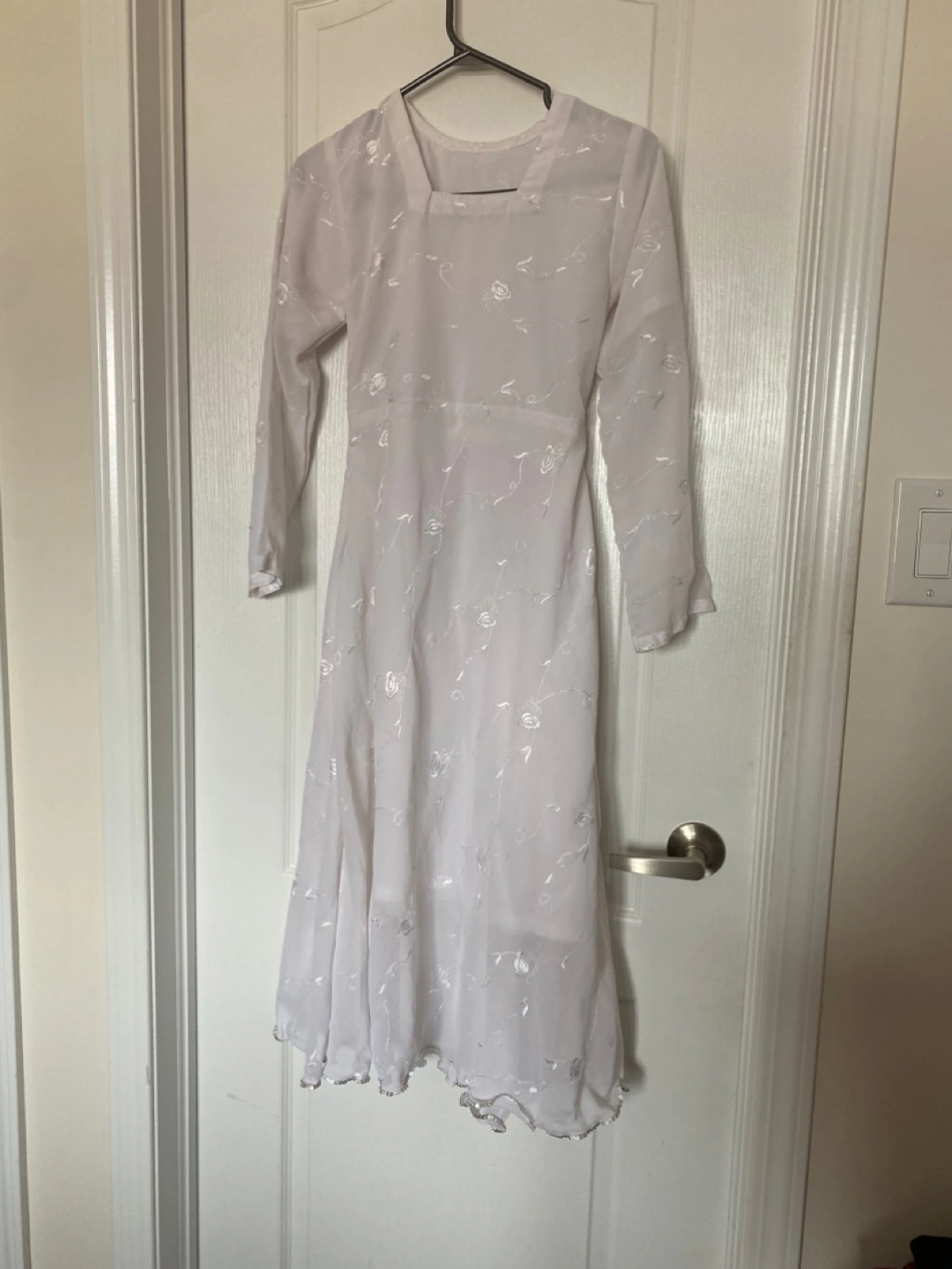 A lovely 2pc white dress. Long sleeves and delicate embroidery. Perfect for a summer day. Taking a walk in the sunshine will be just perfect in this dress.
