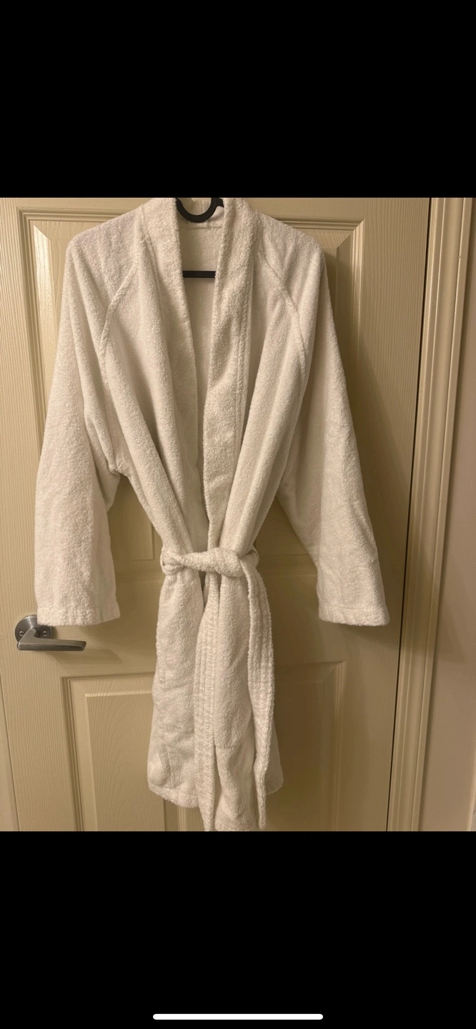 1000+Soft white bathrobe. Three quarter sleeves. Self-tie belt. Relaxing and comfortable.
