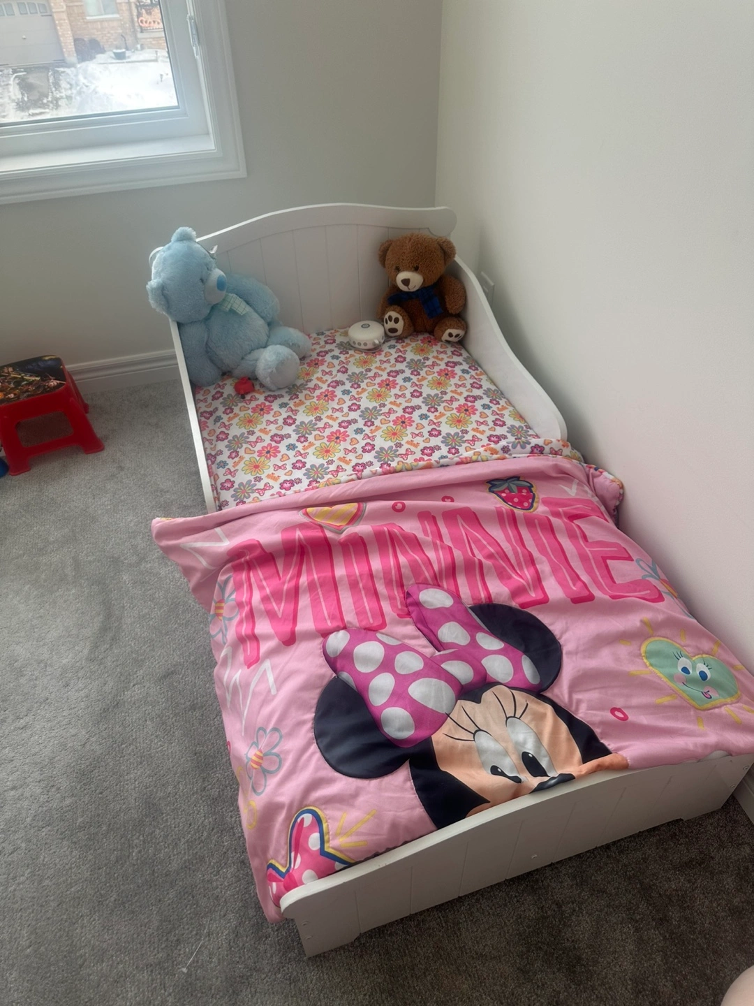 White toddler bed. Low to the ground. Minnie Mouse bedding and mattress included. Very Good condition.