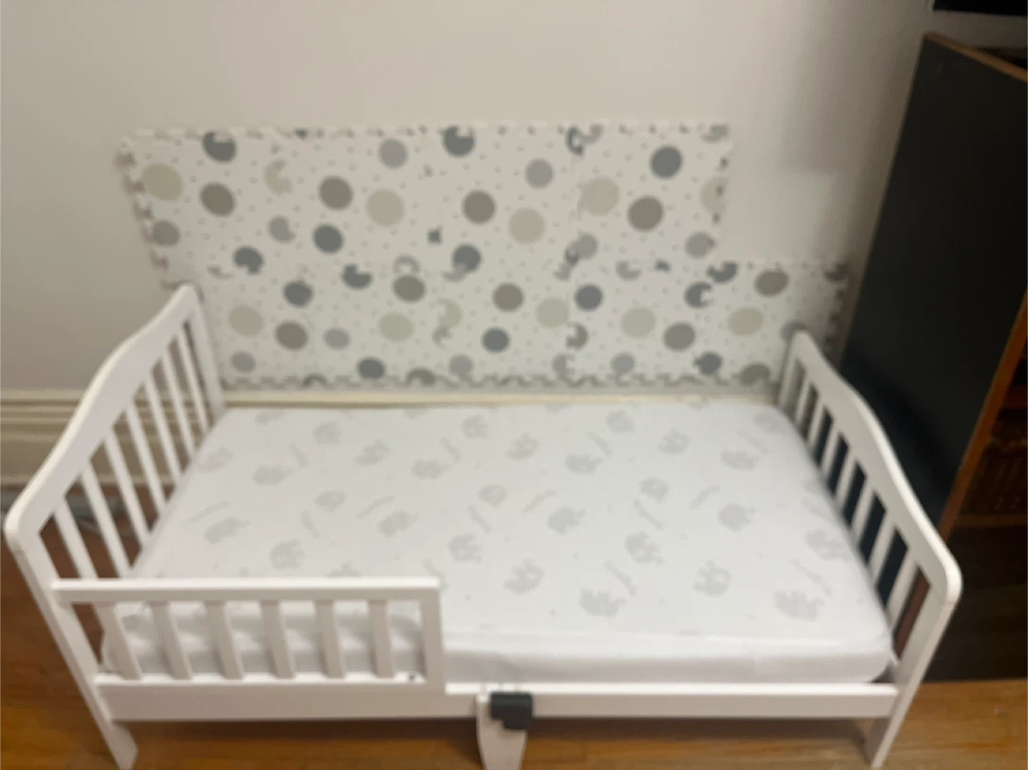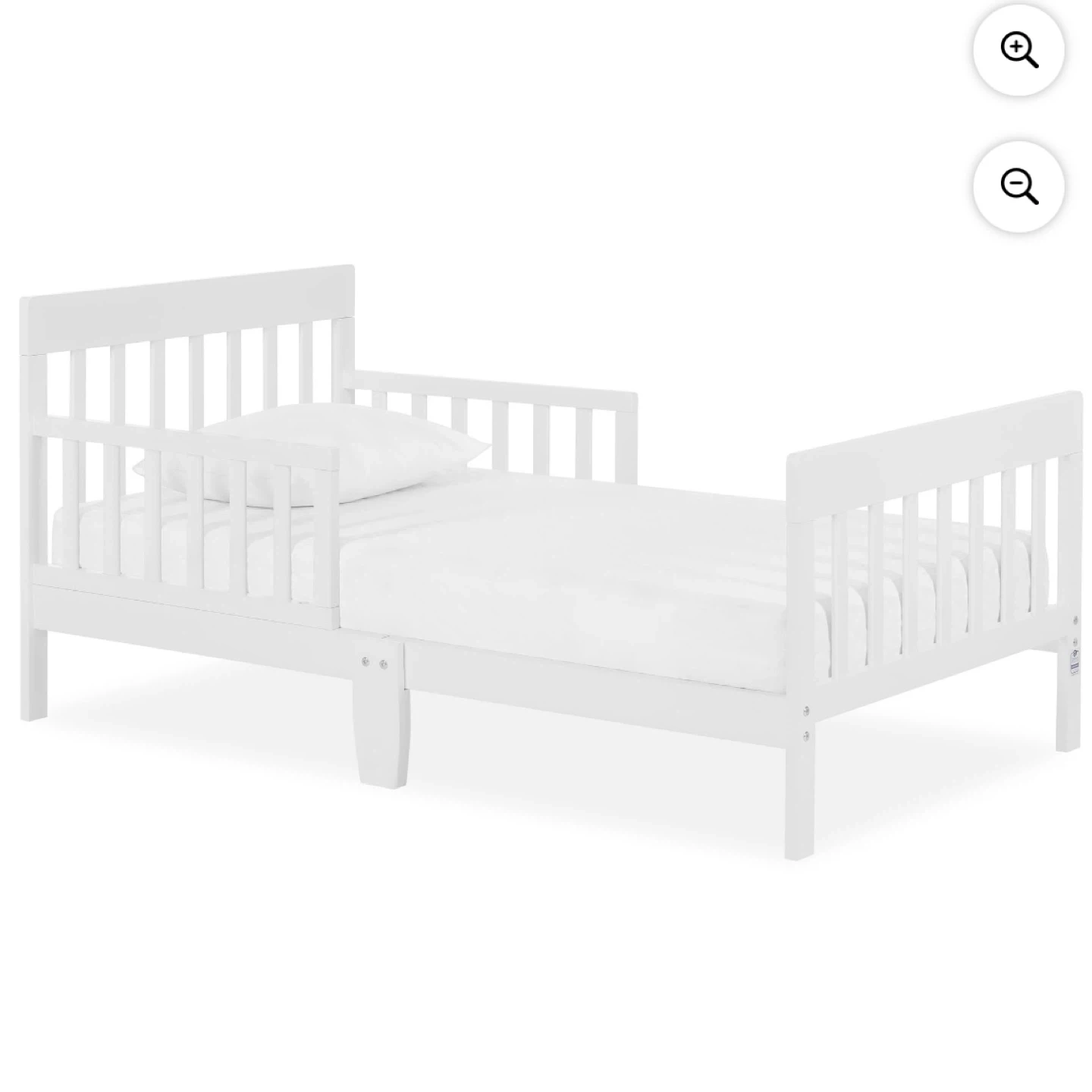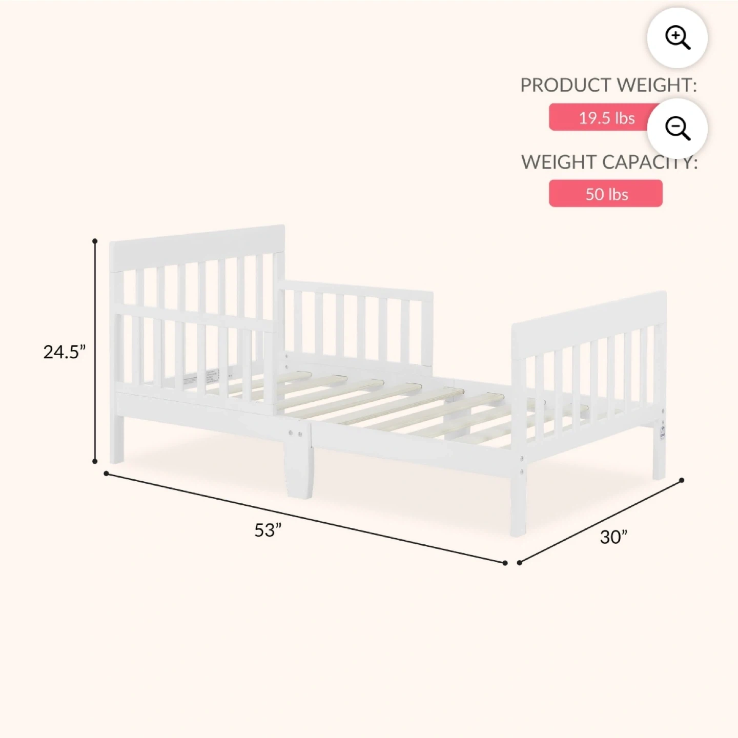 10Selling a toddler bed in great condition! It's white and measures approximately 53" long, 30" wide, and 24.5" high. It can hold up to 50 lbs. Perfect for transitioning your little one from a crib to a bed. If interested in gently use mattress and mattress pad, please let me know.