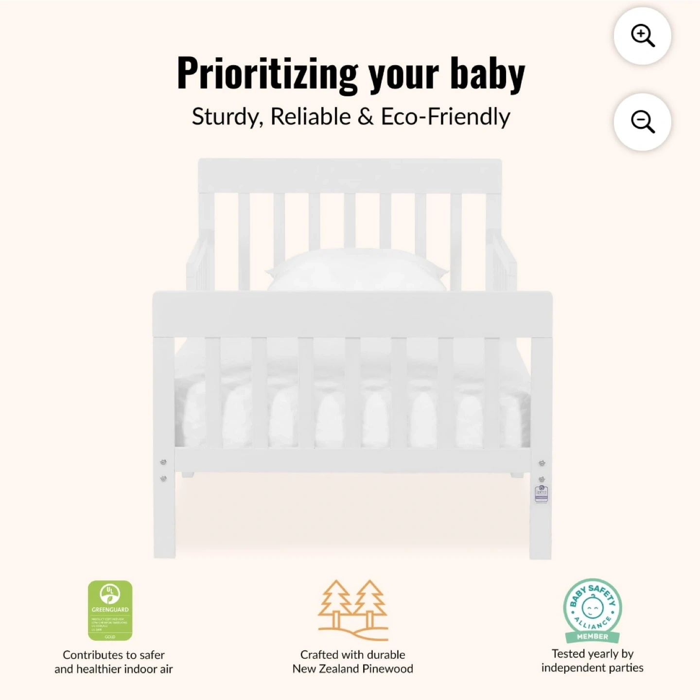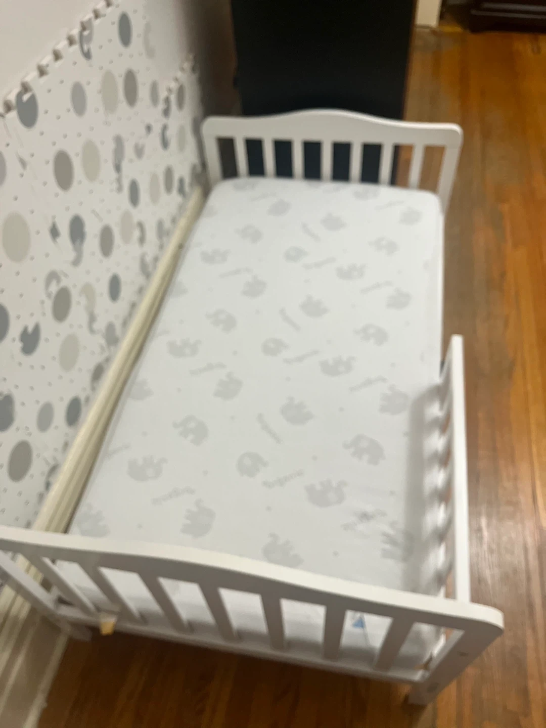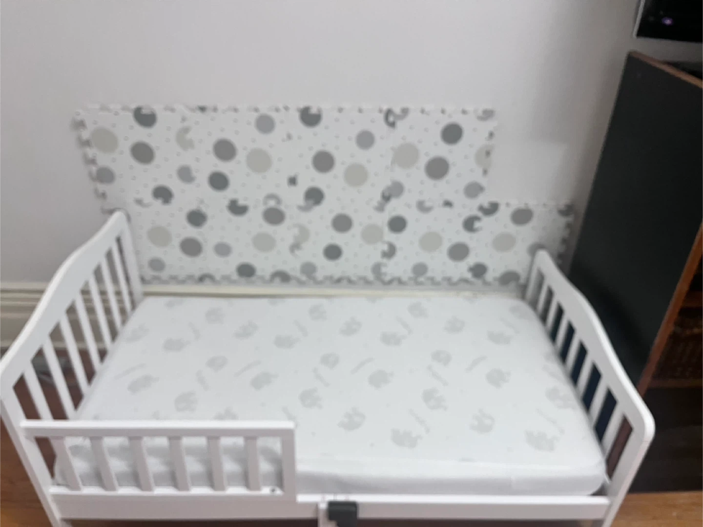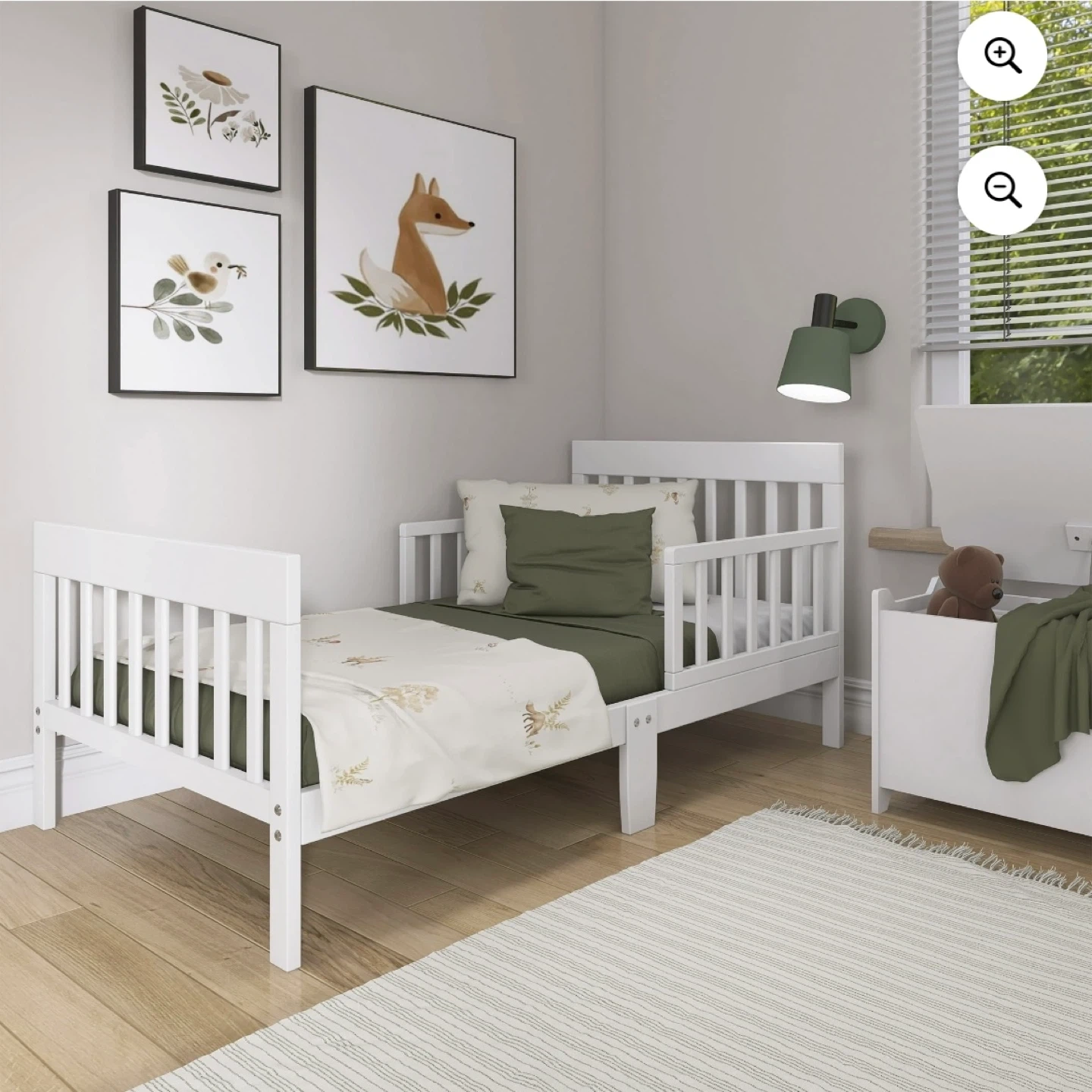10Selling a toddler bed in great condition! It's white and measures approximately 53" long, 30" wide, and 24.5" high. It can hold up to 50 lbs. Perfect for transitioning your little one from a crib to a bed. If interested in gently use mattress and mattress pad, please let me know.