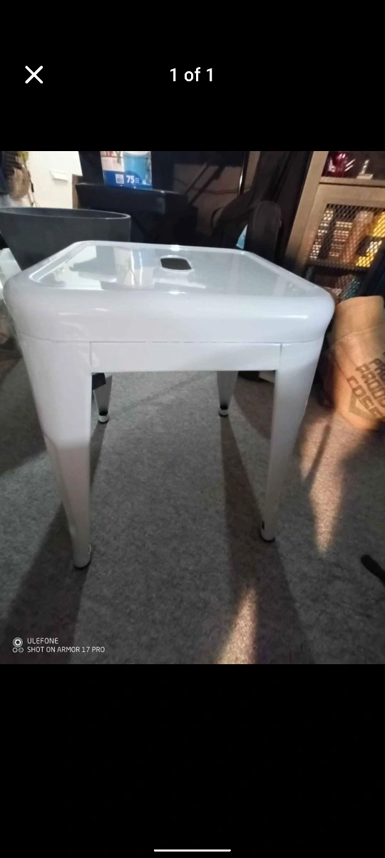 Tolix white metal 18 inch stool, perfect for a small space and desk height. Purchased the wrong color originally and the color I repurchased kept being backordered and then discontinued after it kept telling me it was shipped. This height is difficult to find.