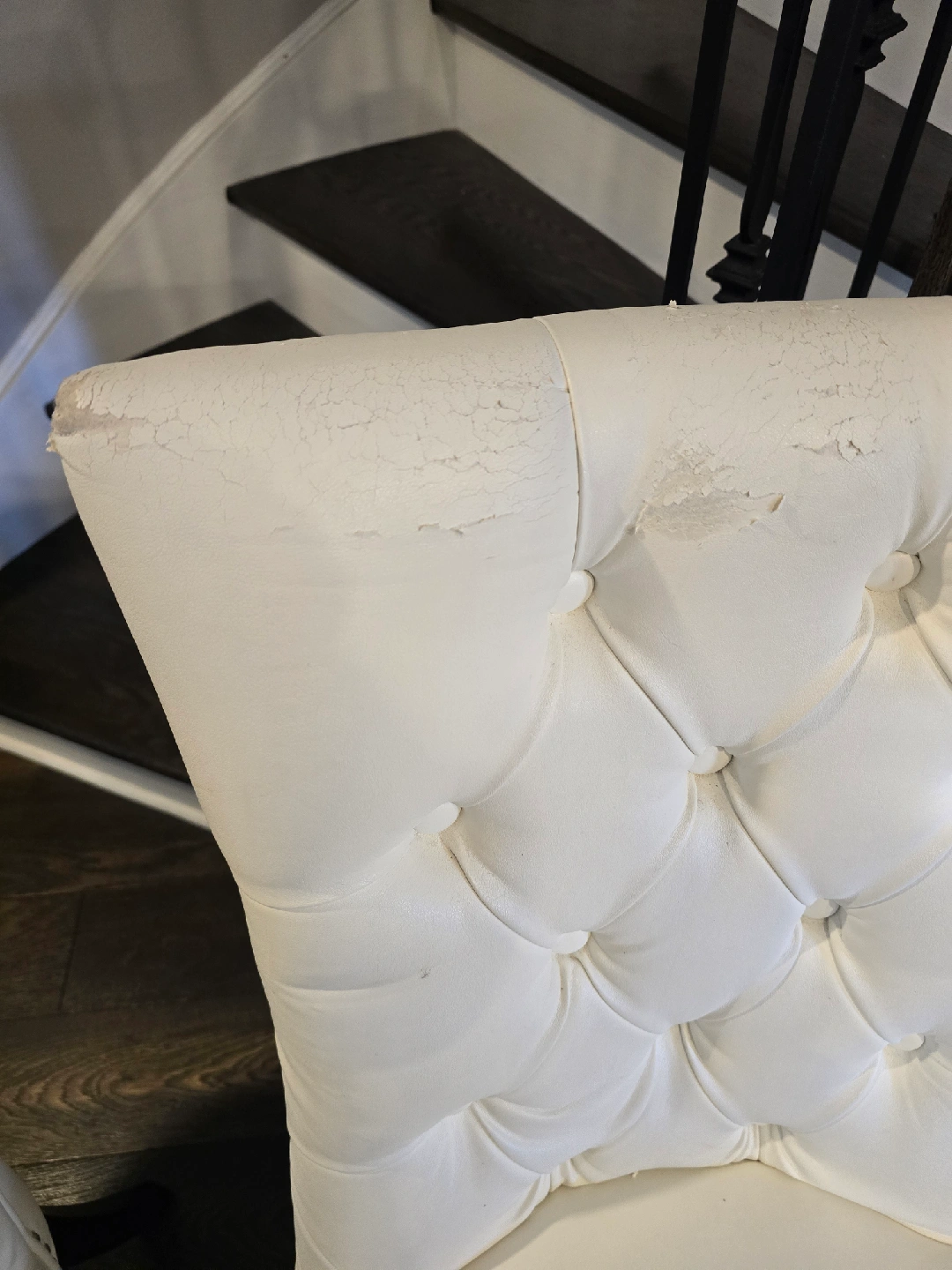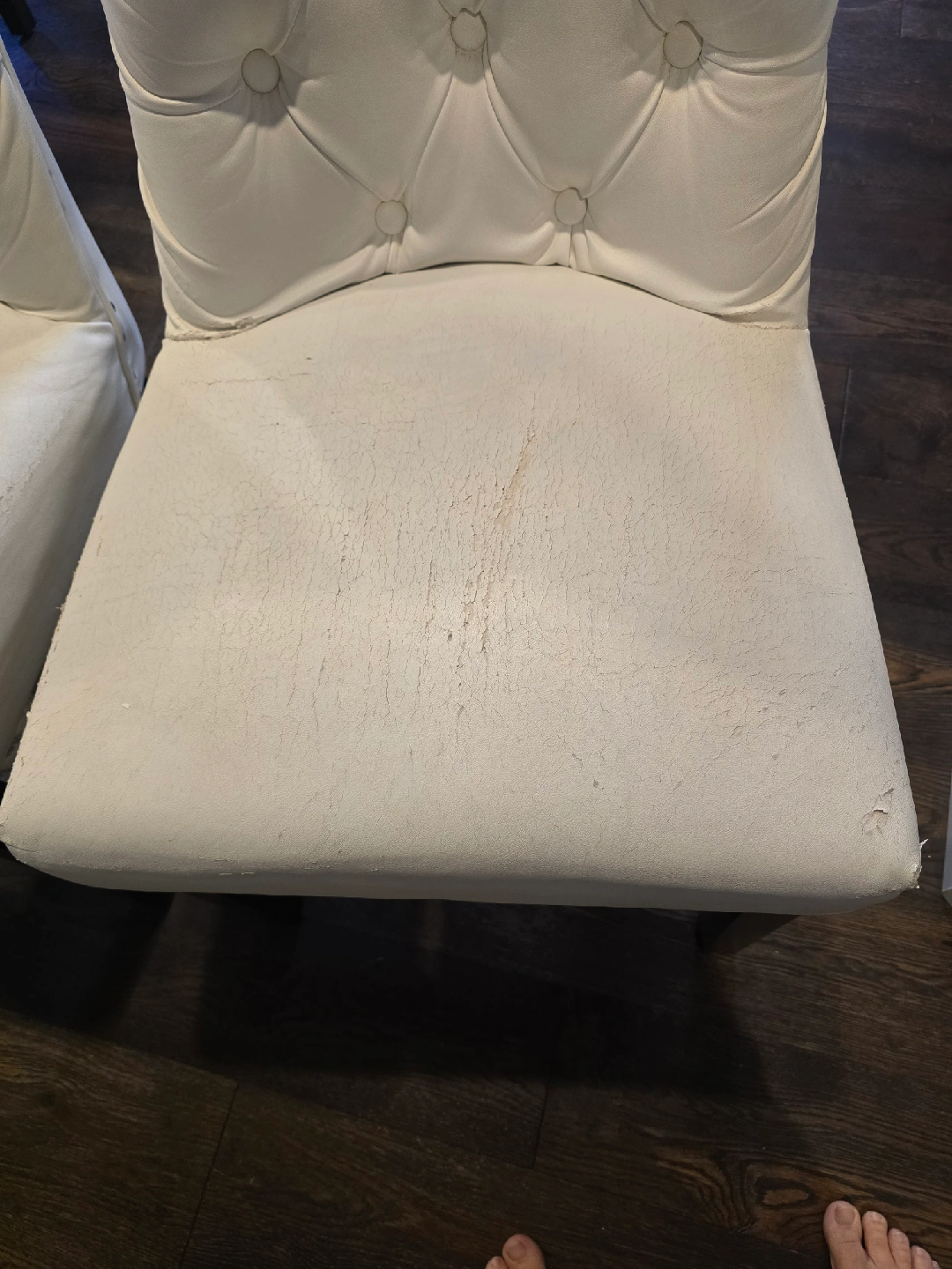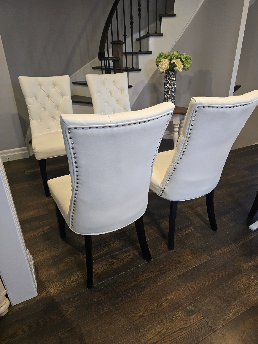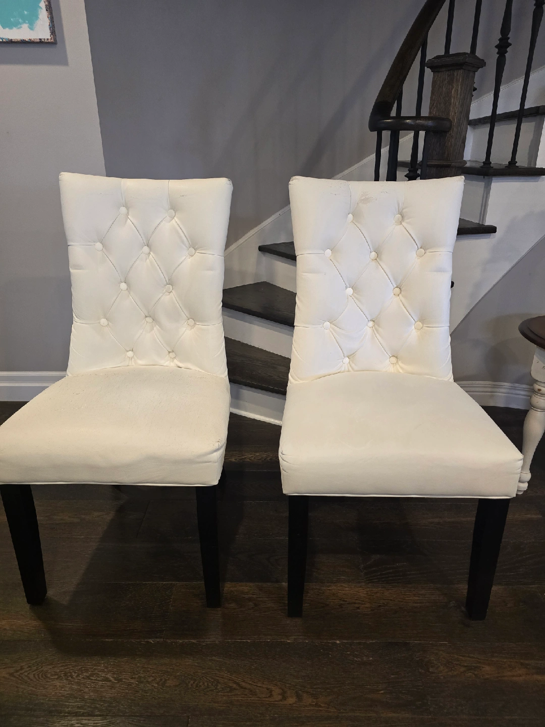 5Selling a set of four white dining chairs. They feature a tufted back and black legs. Please note that there are some signs of wear on the seat and back, as shown in the pictures. That would be a great upholstery project. $25 each.