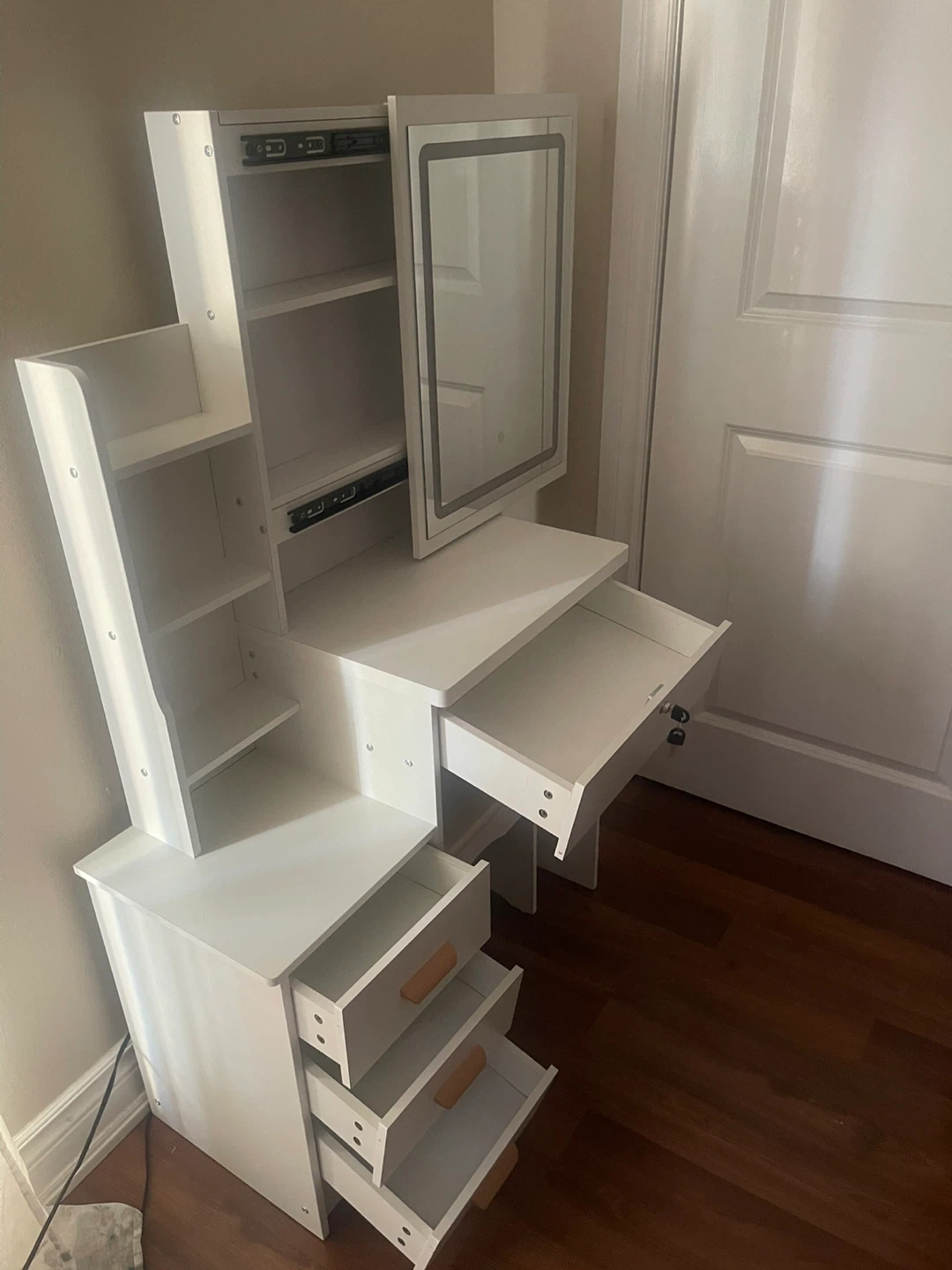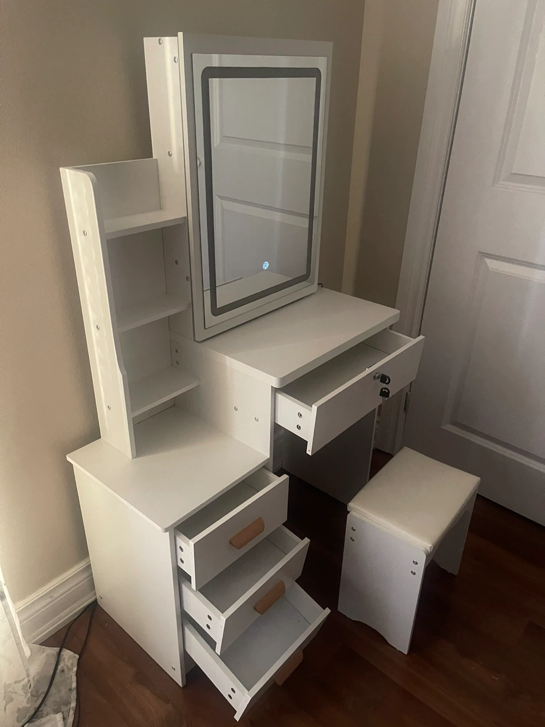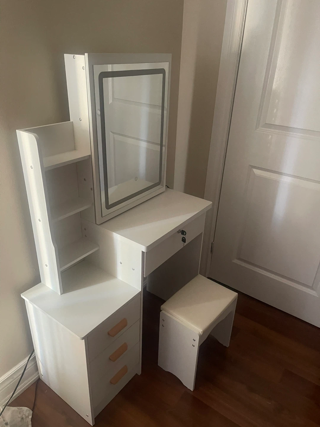 Selling a brand new vanity table with a lighted mirror and stool. It's in great condition and perfect for getting ready! The vanity is white with a modern design, featuring shelves and drawers for storage. The lighted mirror provides excellent illumination for makeup application. Comes with a matching stool for comfortable seating