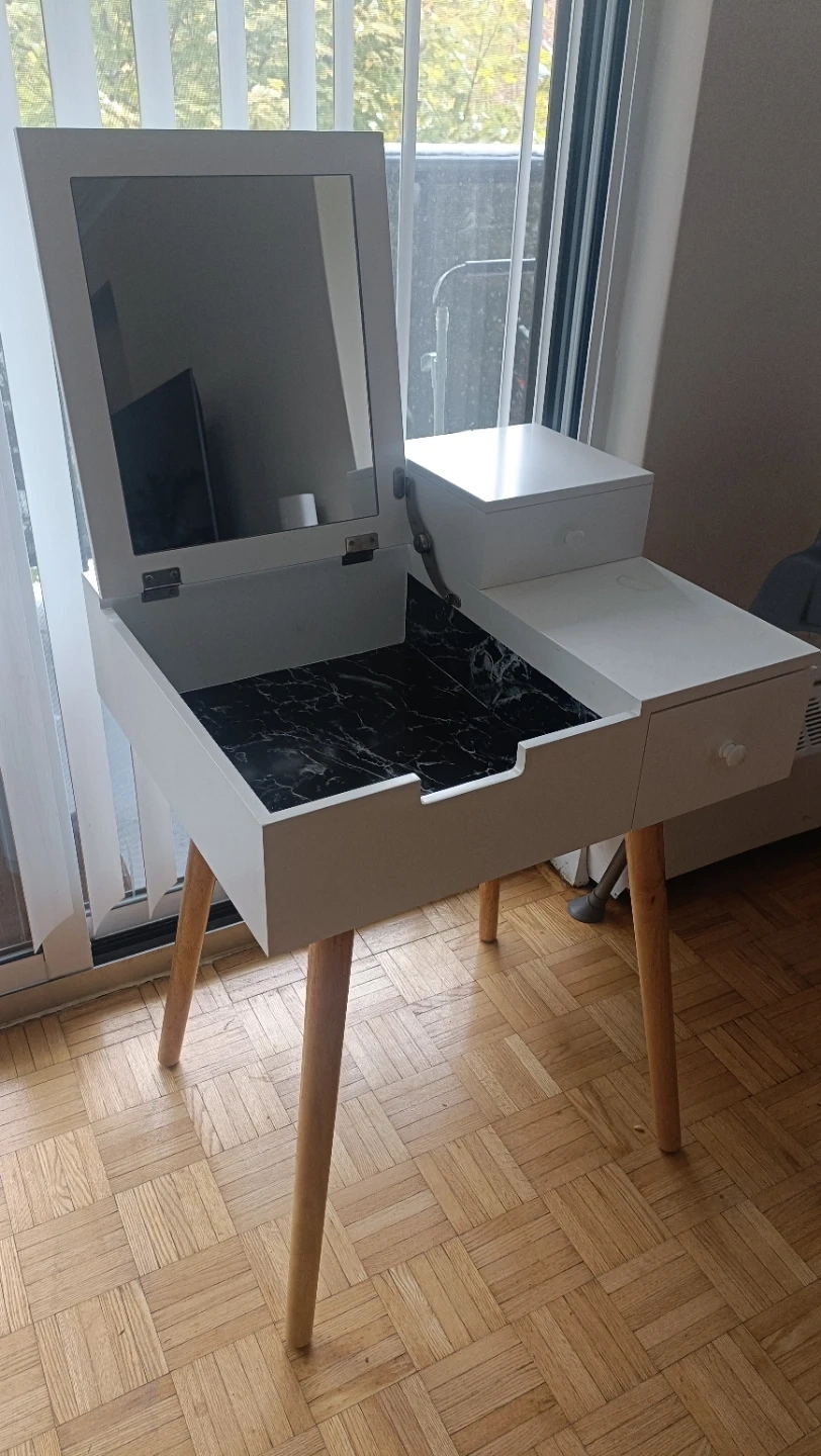 65Selling a cute white vanity table! It has a lift-top mirror, a drawer, and a little storage compartment. The legs are a natural wood colour. Perfect for a small space! Has minor paint issue (see 2nd photo)