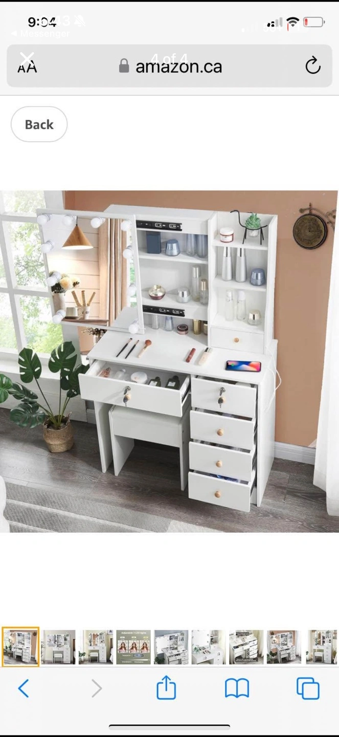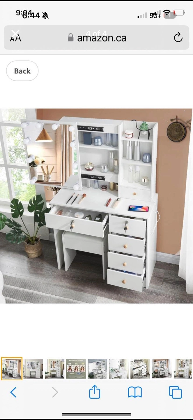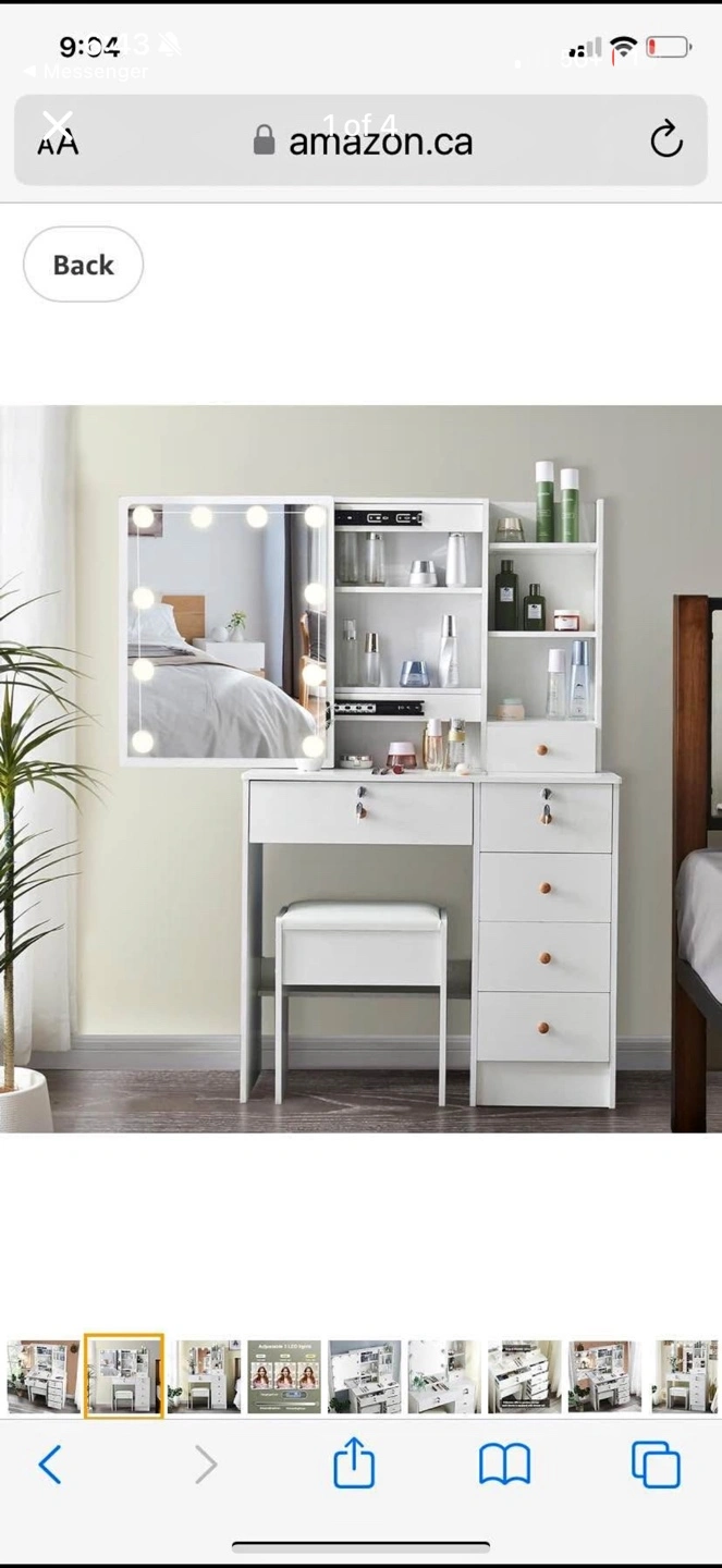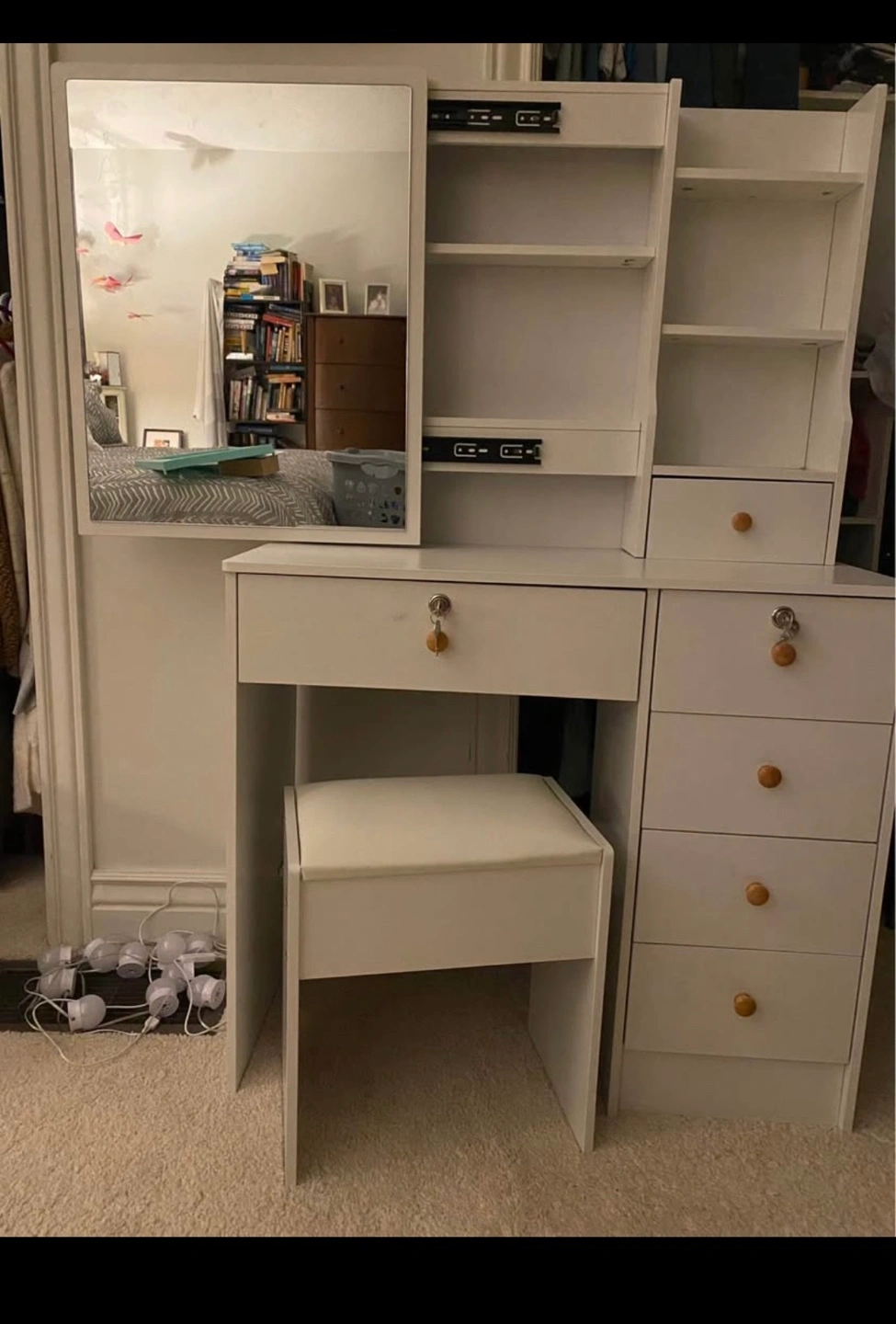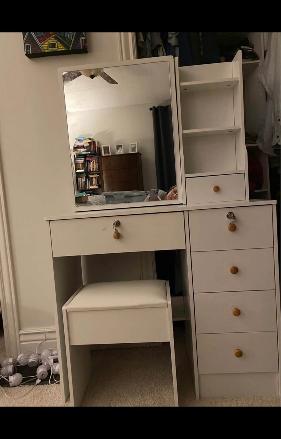 Beautiful white vanity set. Includes a large mirror with built-in lights, a spacious tabletop, multiple drawers, and a matching stool. Excellent for organizing makeup and jewelry. Great condition. I already dismemtal it so it’s it’s easy to pick up and no bulbs!!!