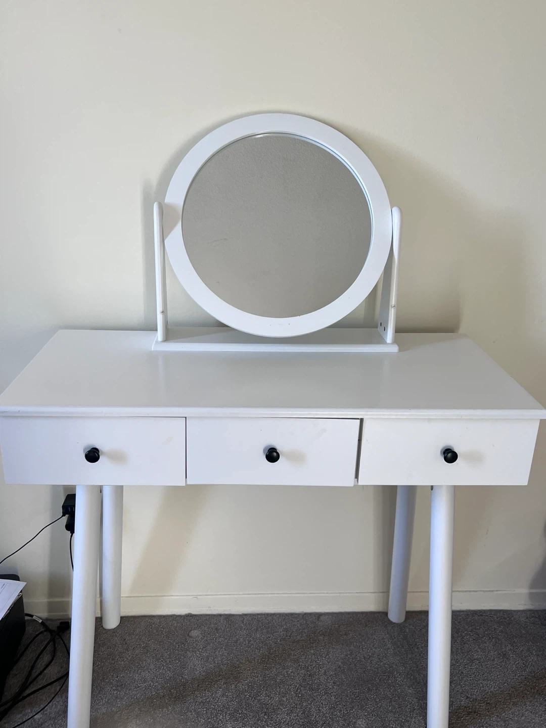 20Selling a cute white vanity table! It comes with a round mirror that's perfect for getting ready. The table features three drawers, providing ample space for storing your makeup and accessories. It's in great condition and would look lovely in any bedroom or dressing area