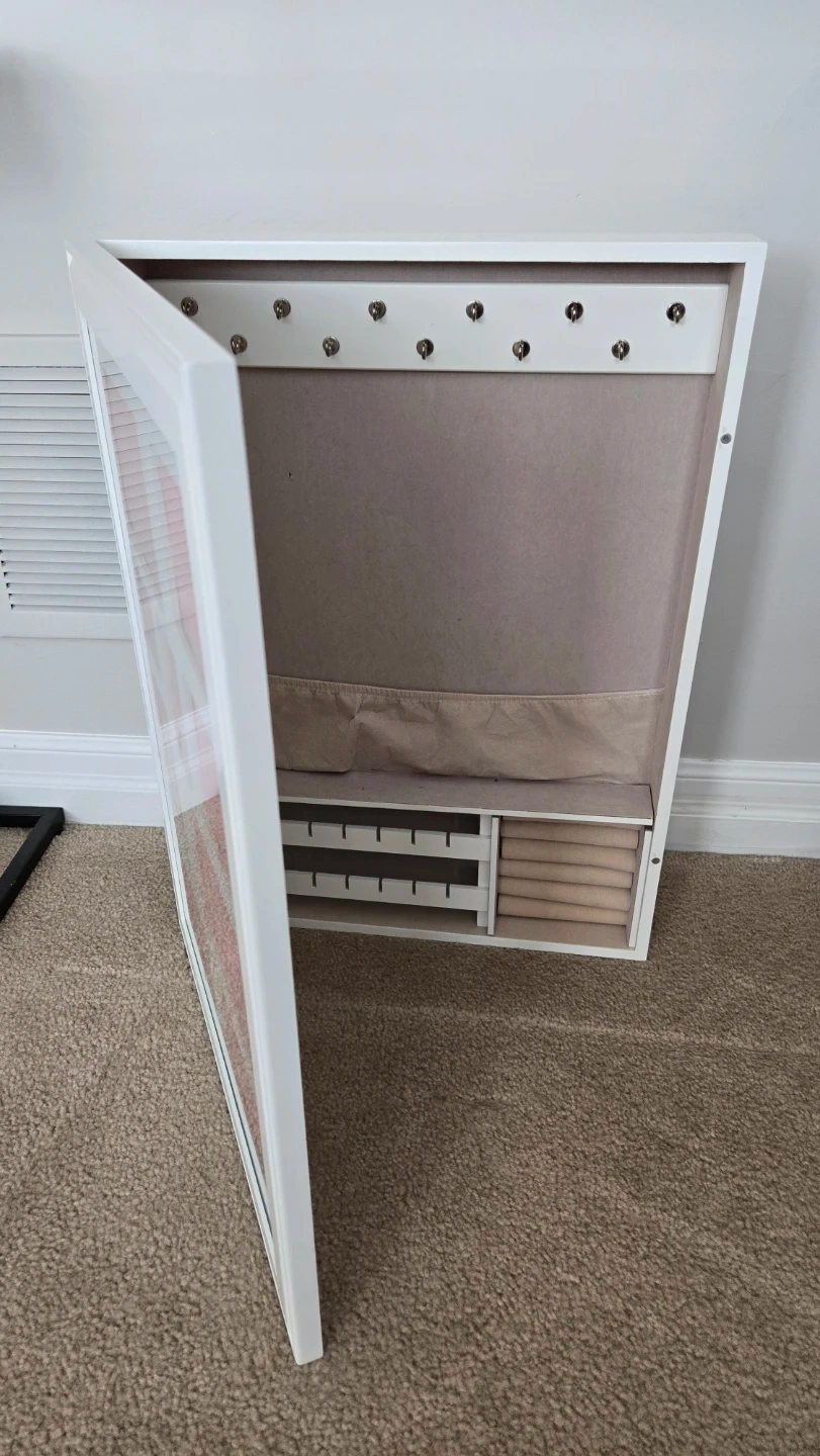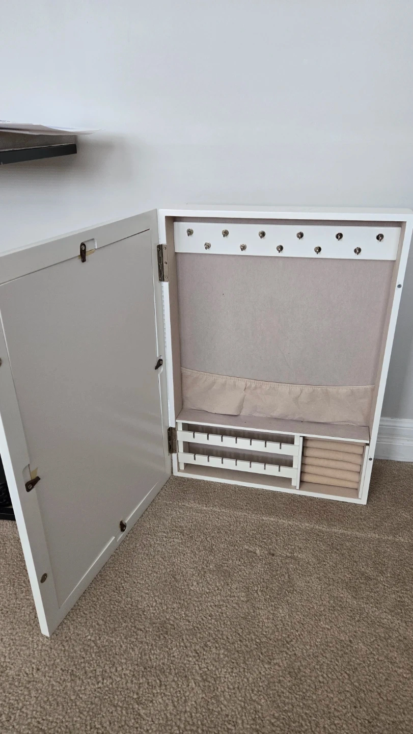 15Here's a lovely white wall-mounted jewelry organizer! It's perfect for keeping all your favourite pieces neat and tidy. It has hooks, shelves, and compartments to store necklaces, earrings, rings, and more. It's in great condition and ready for a new home!
