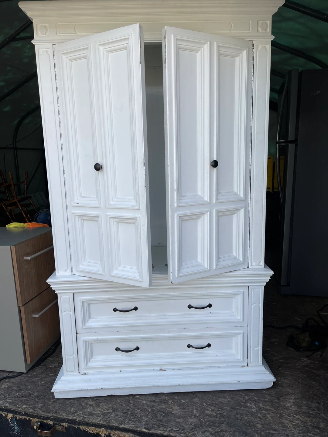 Selling a white wardrobe with drawers. It's in great condition and offers plenty of storage space. Perfect for organizing your clothes and other belongings! It has a classic design that would fit well in any room.
