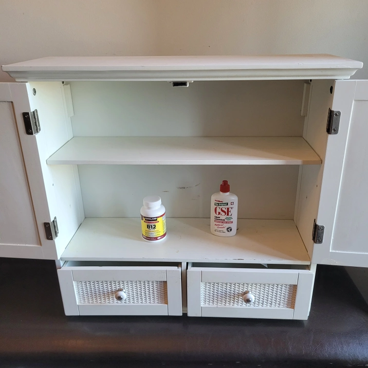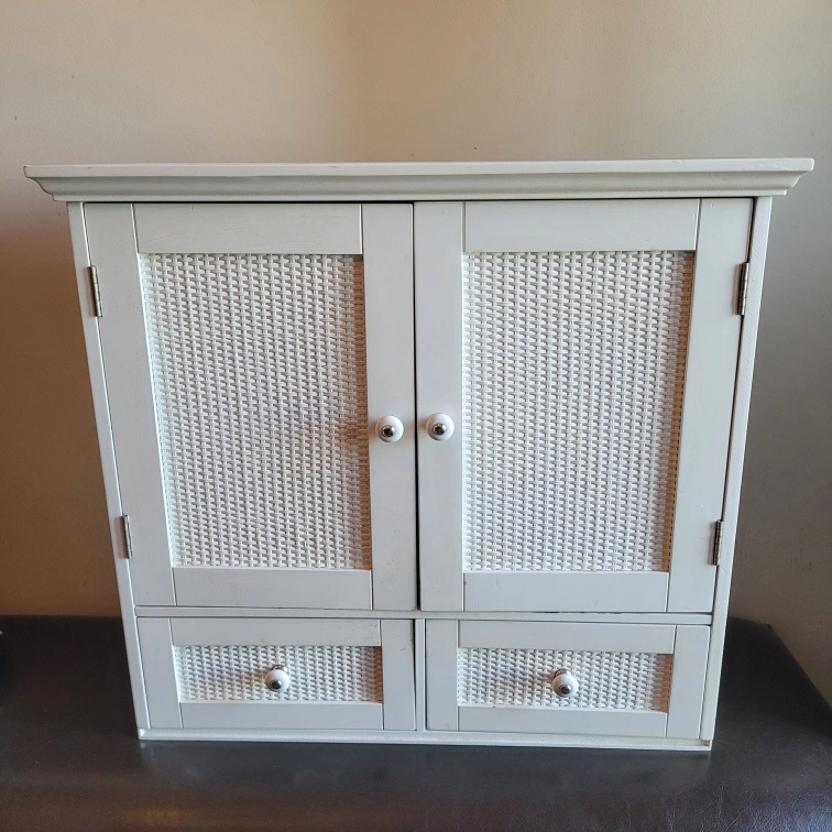 Here's a charming white wicker medicine cabinet, perfect for adding a touch of style to any room! It features a combination of cabinet and drawer space, offering versatile storage options. The woven detailing on the doors and drawers adds a unique texture and visual appeal. It's in great condition and ready to find a new home