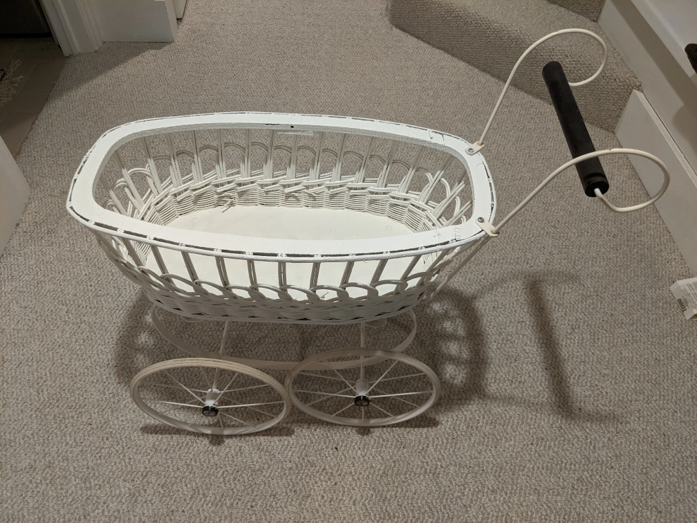 372White wicker doll pram with a black handle and 4 wheels. Handlebars come up to 70 cm. Appropriate for holding dolls, not children!