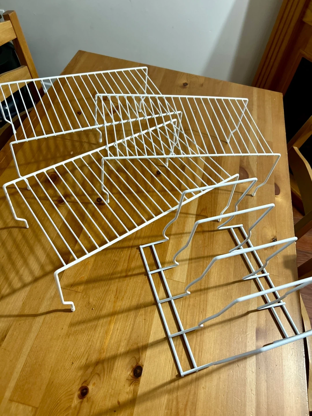 Selling a set of white wire shelf organizers. These are great for adding extra storage space in your kitchen, pantry, or closet. They are in good condition and ready to use!