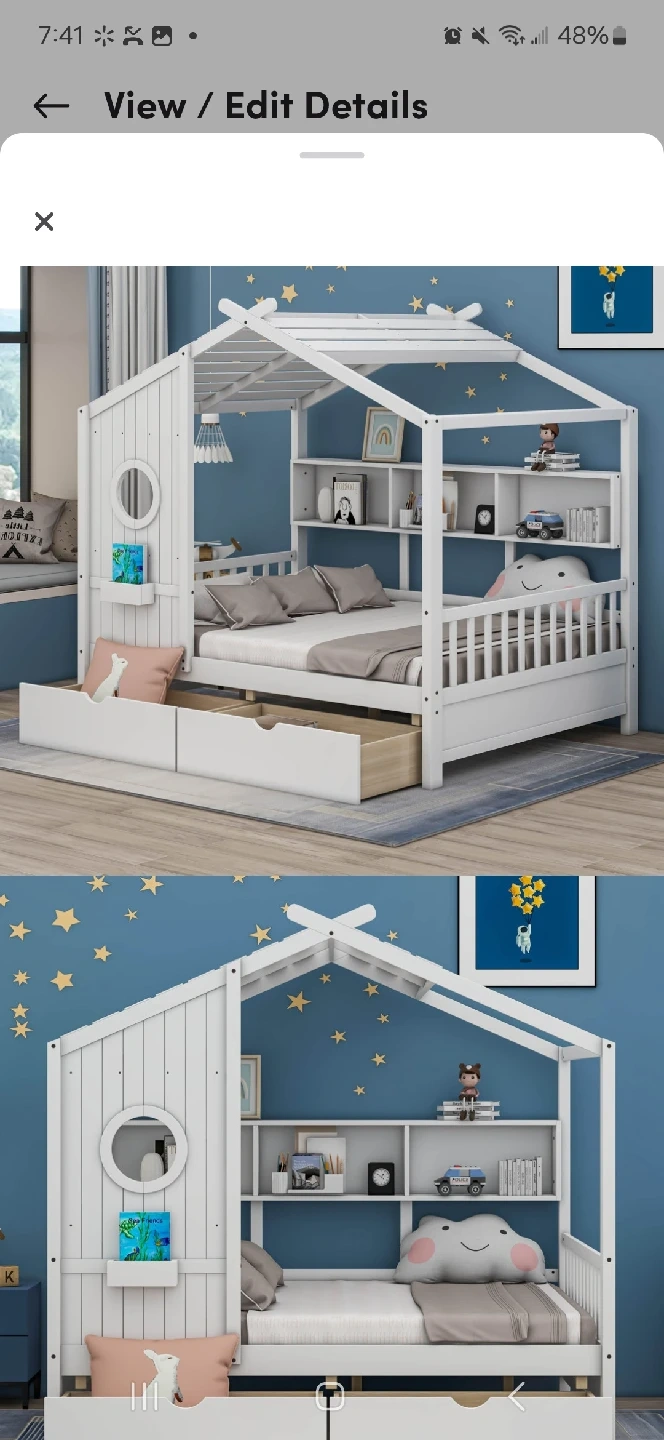 5This adorable white wood house bed frame will make bedtime fun! It features a charming house design with built-in shelving and storage drawers underneath. Perfect for a kids' room or guest room, it adds a touch of whimsy and practicality to any space. Dimensions are included in the photos