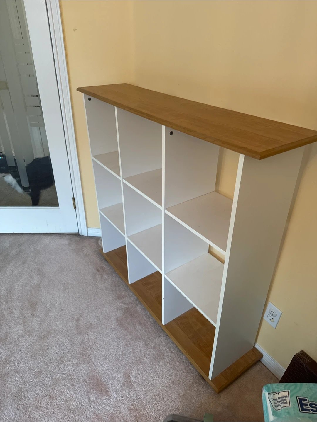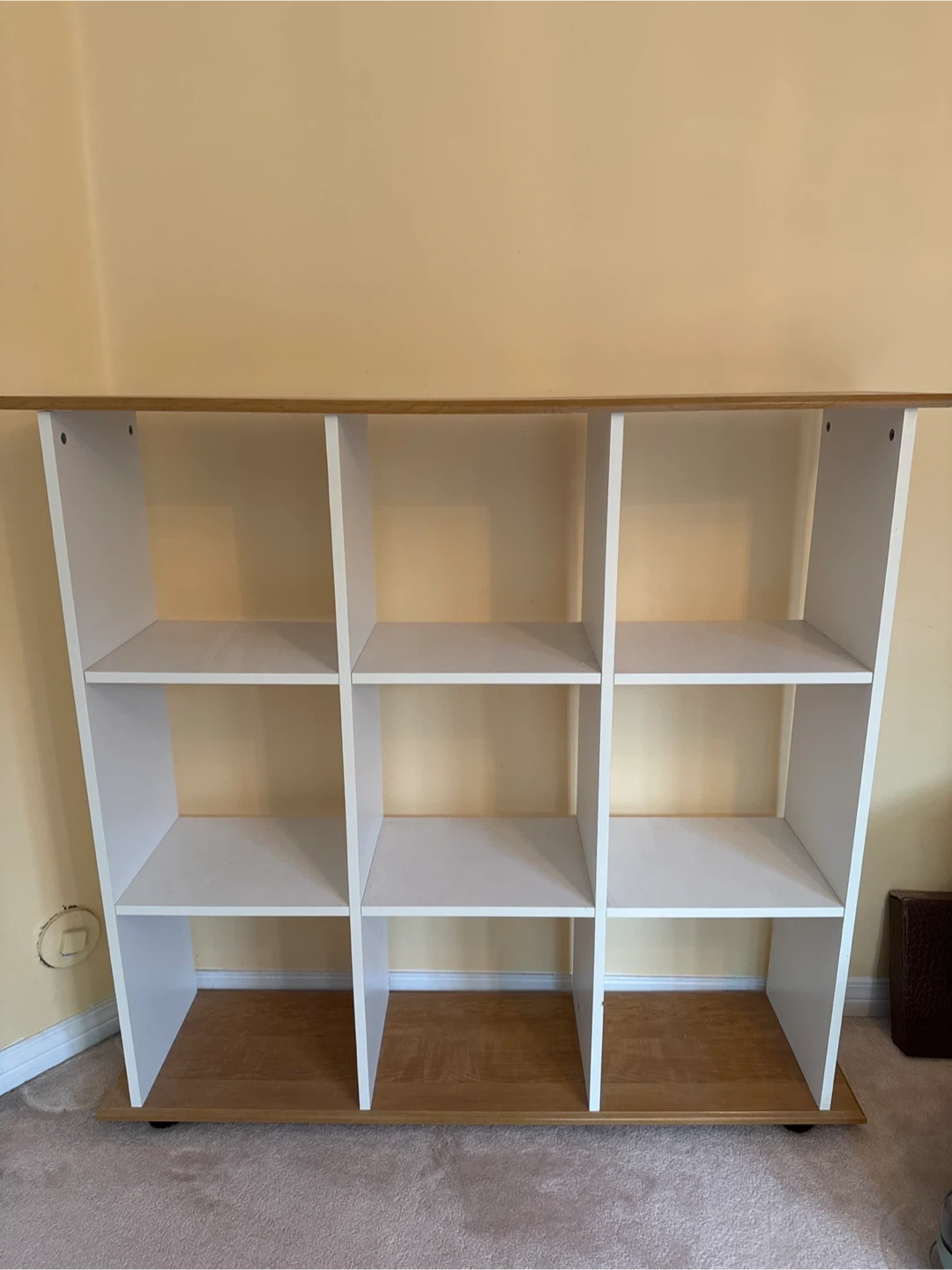 66Here's a shelf unit with a white frame and wood-tone top and bottom on wheels. It has nine cubbies, perfect for storage or display. It's in great shape and ready for a new home.