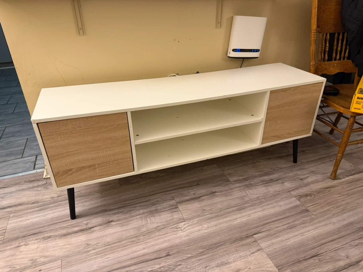 16Selling a TV stand with a white top and light wood doors. It has some minor wear and tear, as shown in the photos, but it's still in good condition and very functional. Perfect for a living room or entertainment area!
