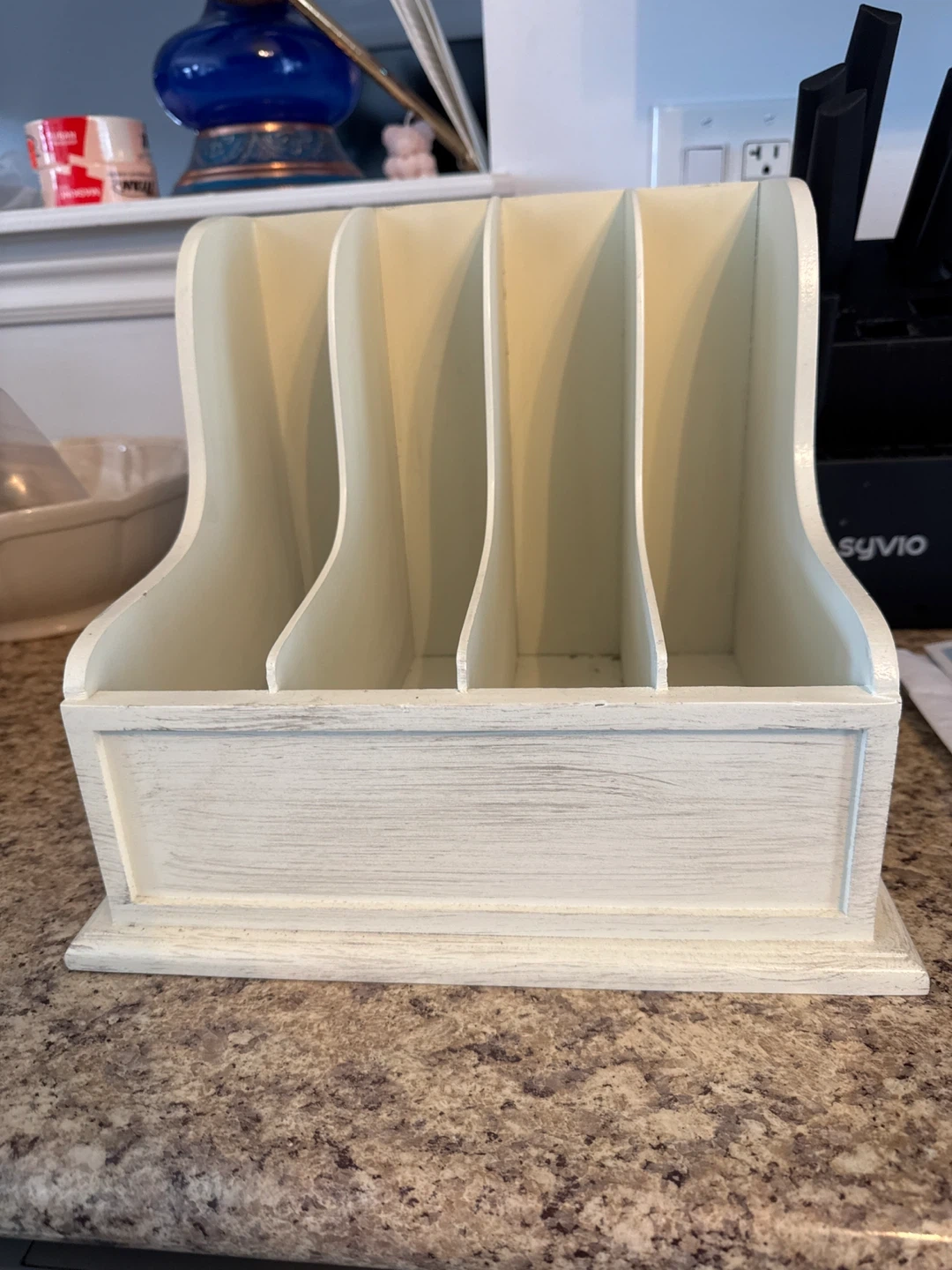 71This is a cute white wooden mail organizer! It has four slots to keep your mail and documents tidy. It has a slightly distressed finish for a rustic look