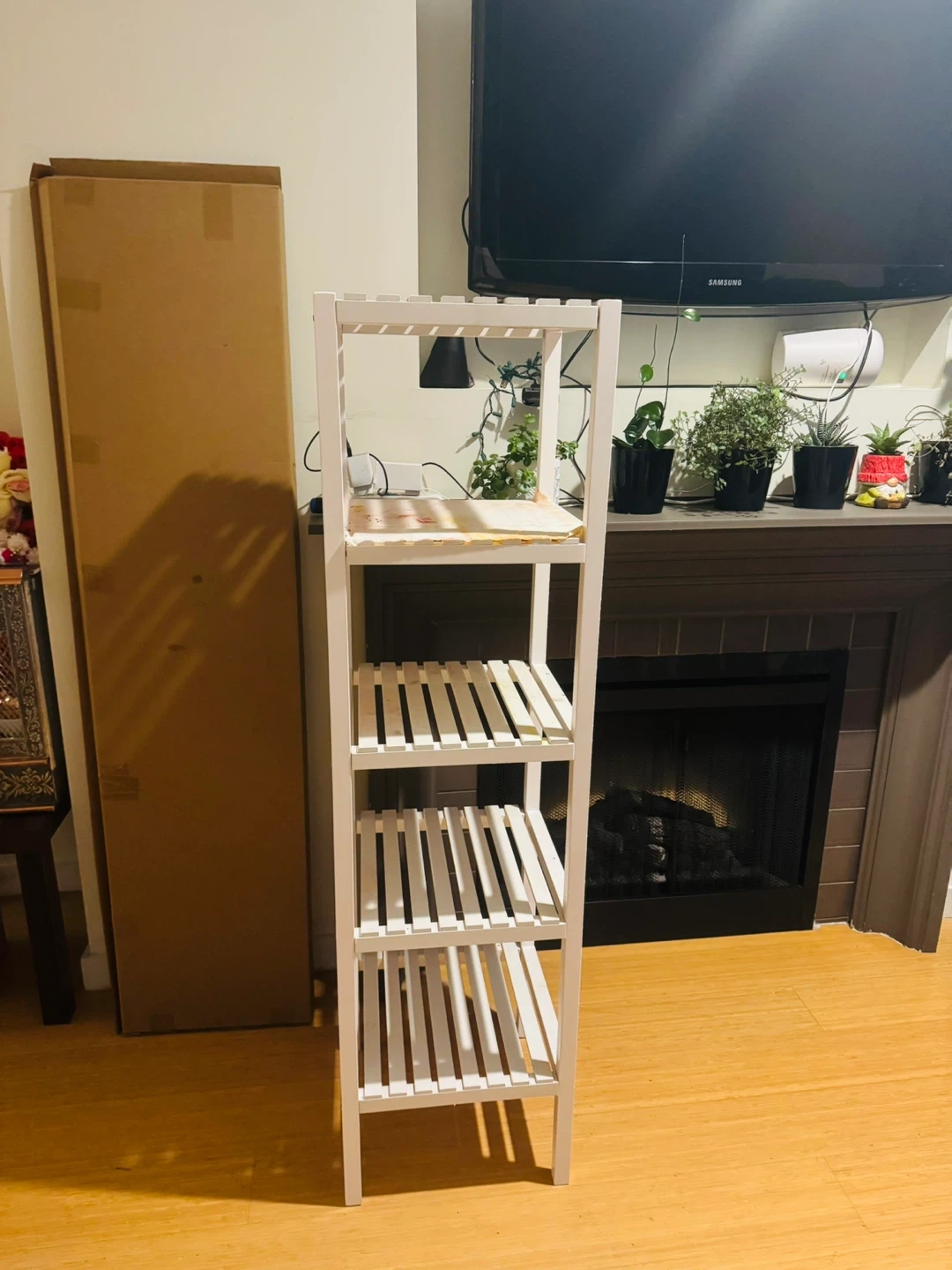 Selling a white wooden shelf unit. It has four shelves and is great for plants or books. It's in good condition and comes with its original box