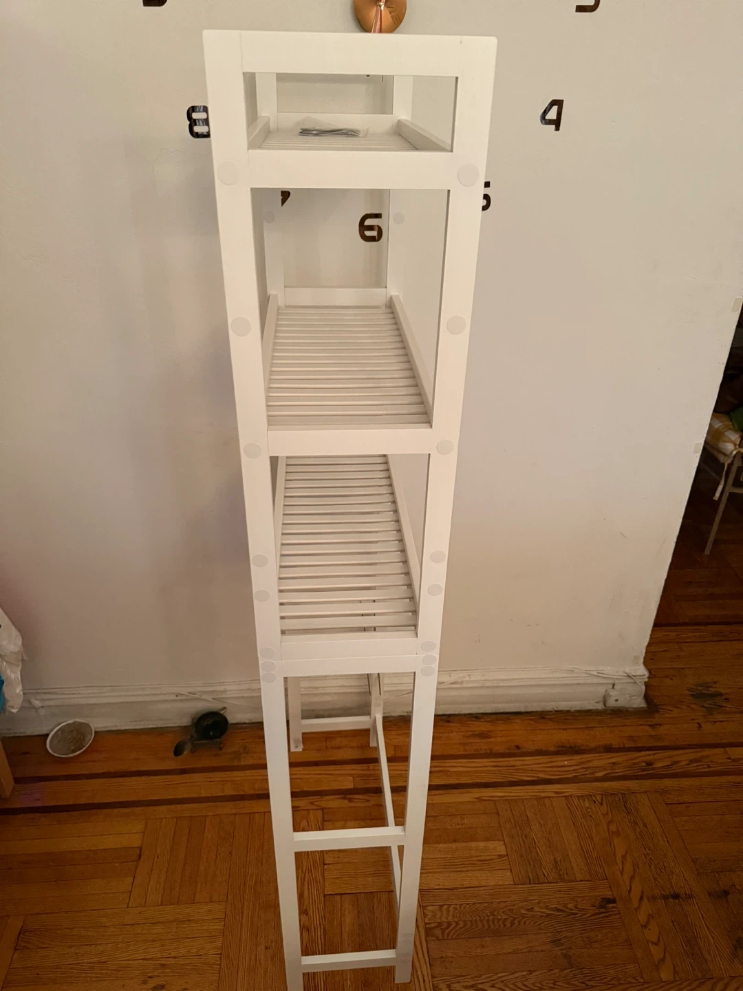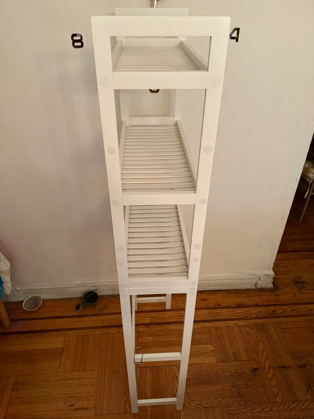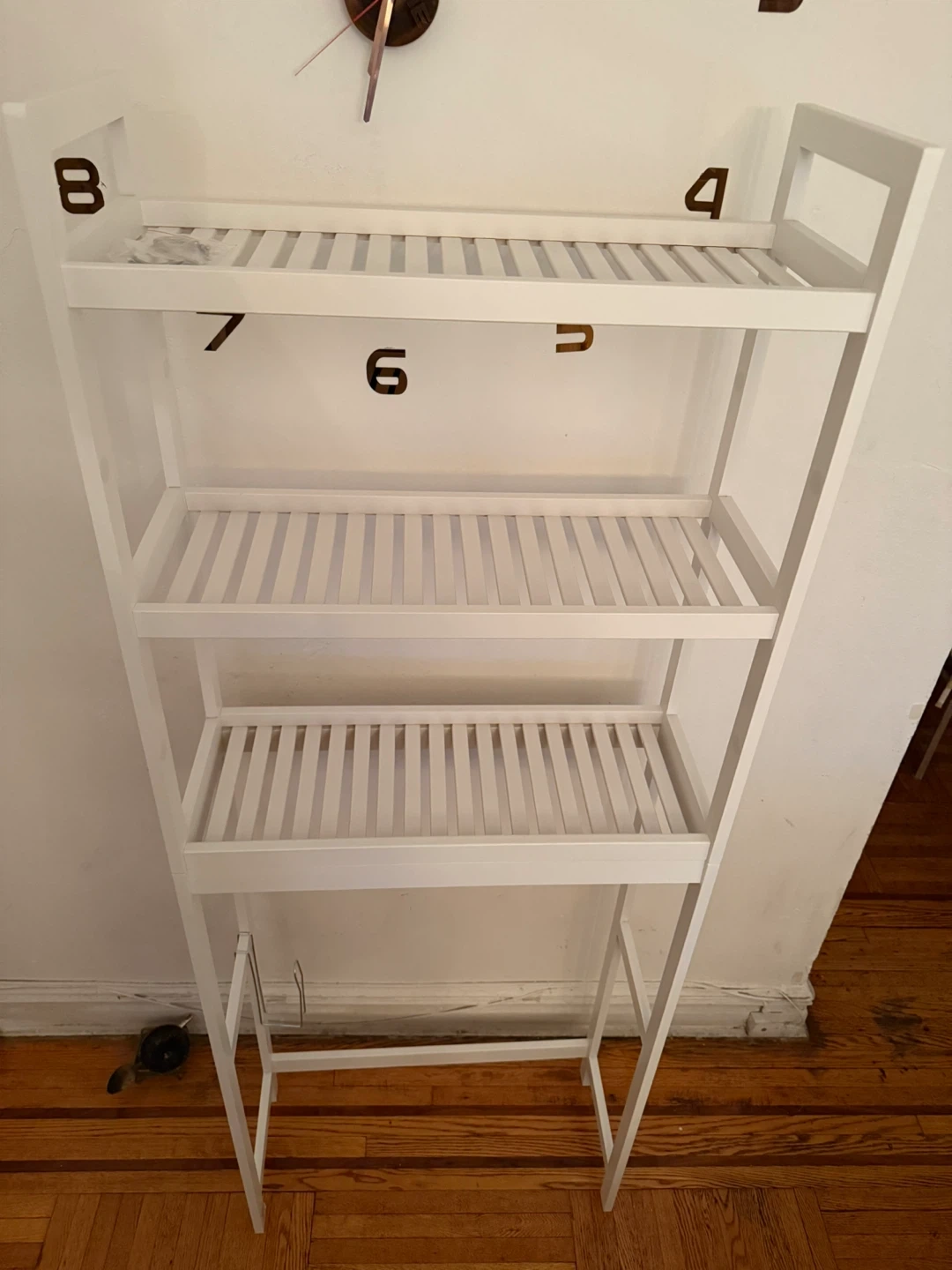 Selling a white wooden shelf in good condition! It's perfect for adding some extra storage space to any room. It's sturdy and has a clean, simple design that will fit in with any decor