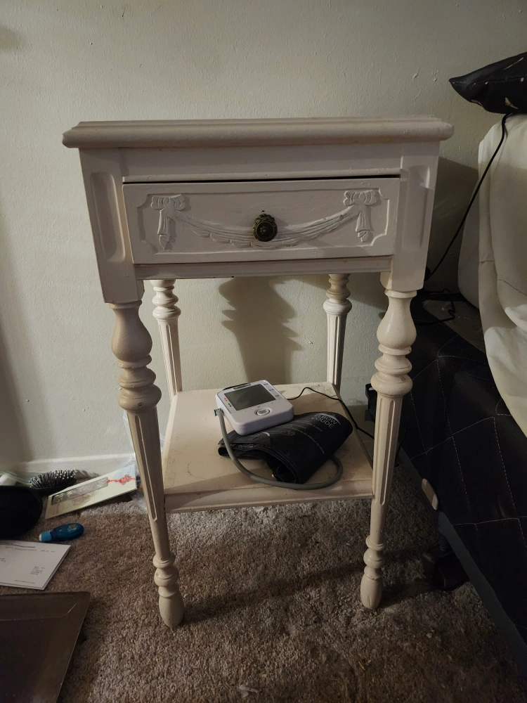40Selling a cute white wooden side table! It has one drawer and a lower shelf for extra storage. It's in good condition and would look great in any room. Measurements: - Height: 28 inches - Width: 15 inches - Depth: 15 inches