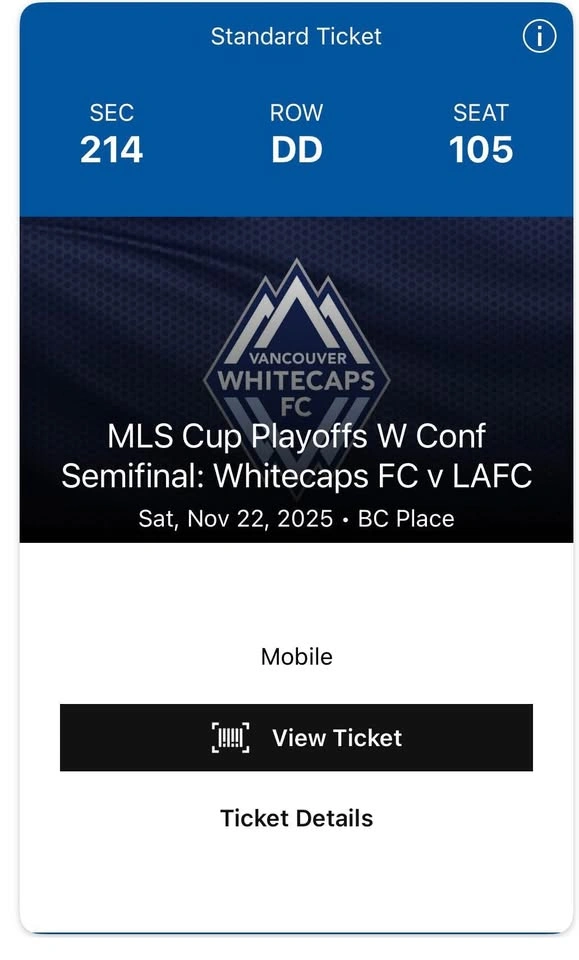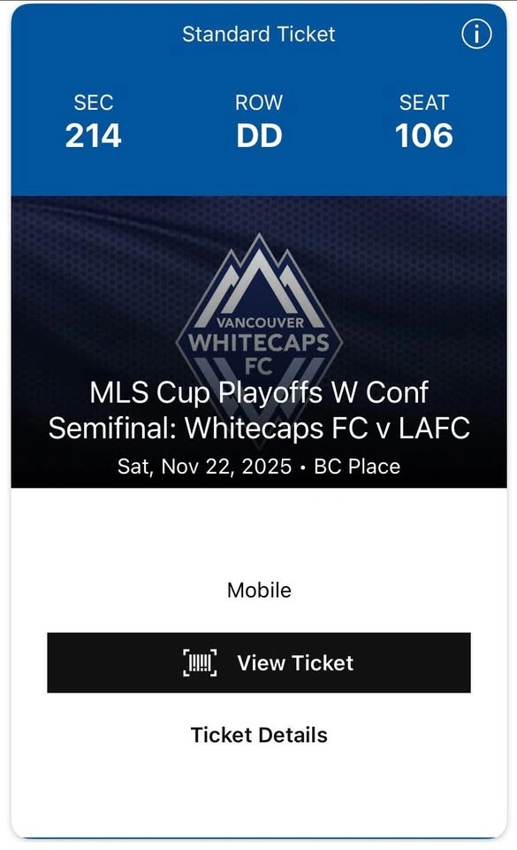 5Whitecaps vs LAFC Conference Semi Final x 2 Tickets Nov.22 Lower Bowl Center Field 2 Tickets Section: 214 Row: DD $350 each. Will only sell as pair. Will transfer directly on ticket master