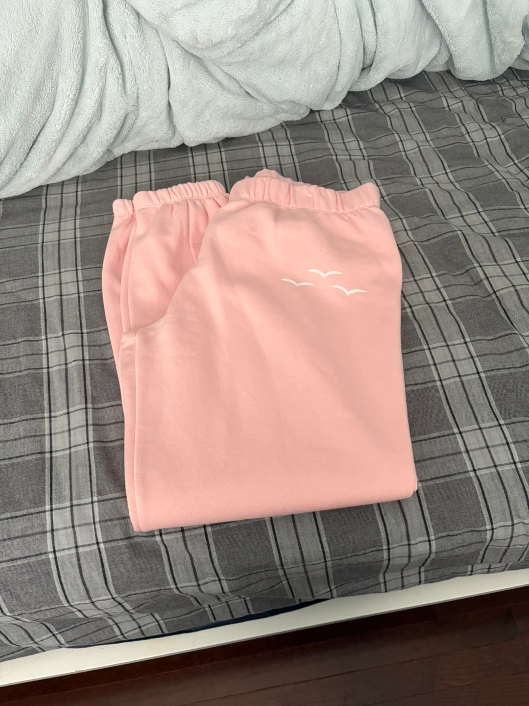 These pink sweatpants have an elastic waistband and cuffs. They feature a small graphic of three birds near the left hip. Made from a soft fabric, they're comfy for lounging or casual wear.
