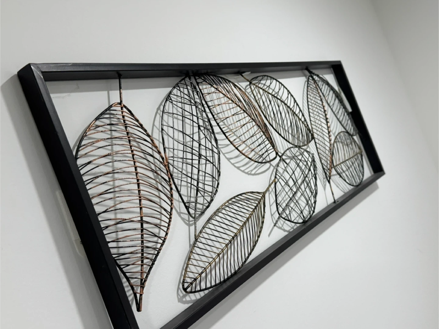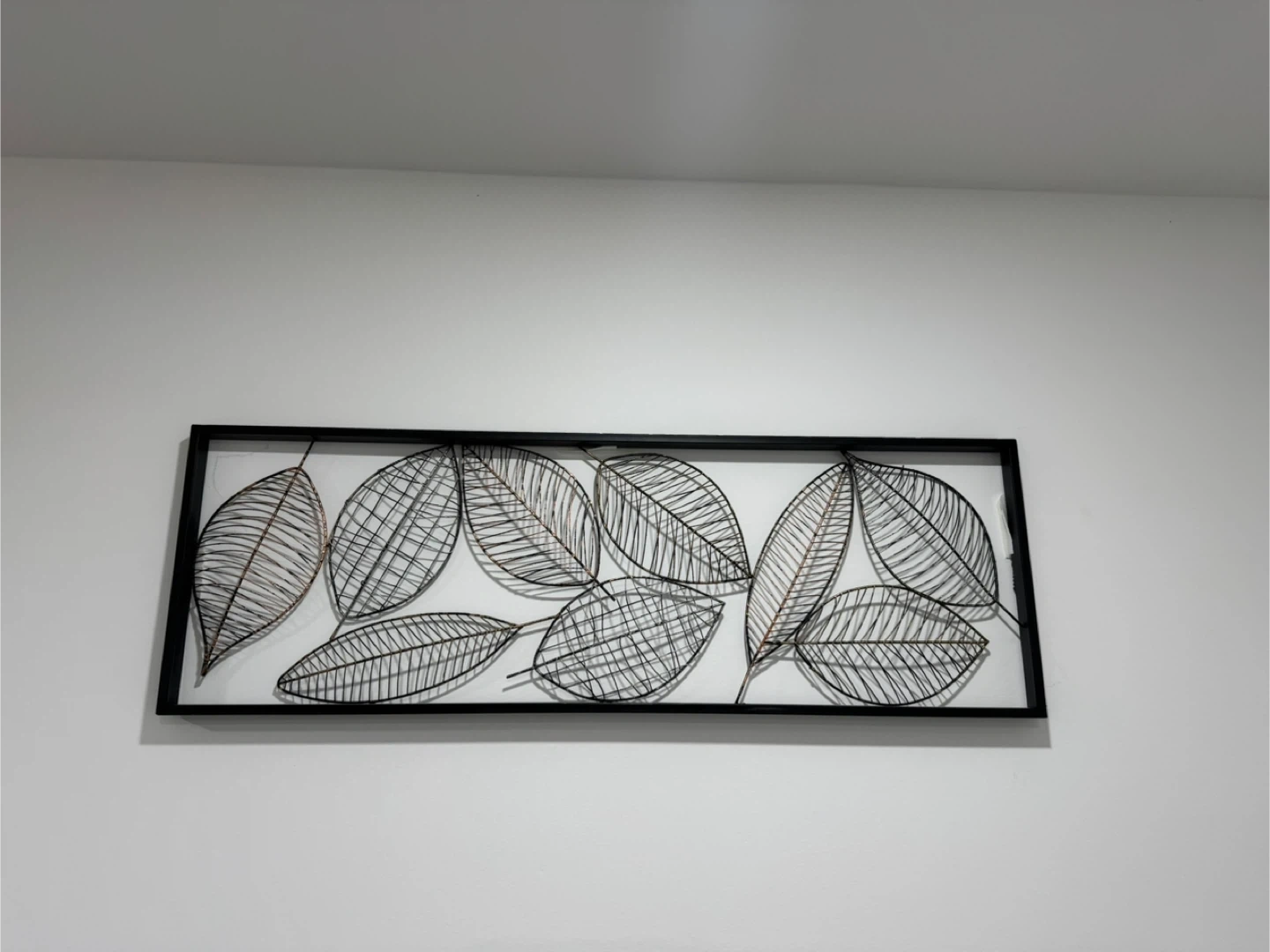 Add a touch of nature to your home with this stylish metal leaf wall art! It features a black frame and intricate leaf designs. It’s in great condition and ready to hang in your living room, bedroom, or entryway